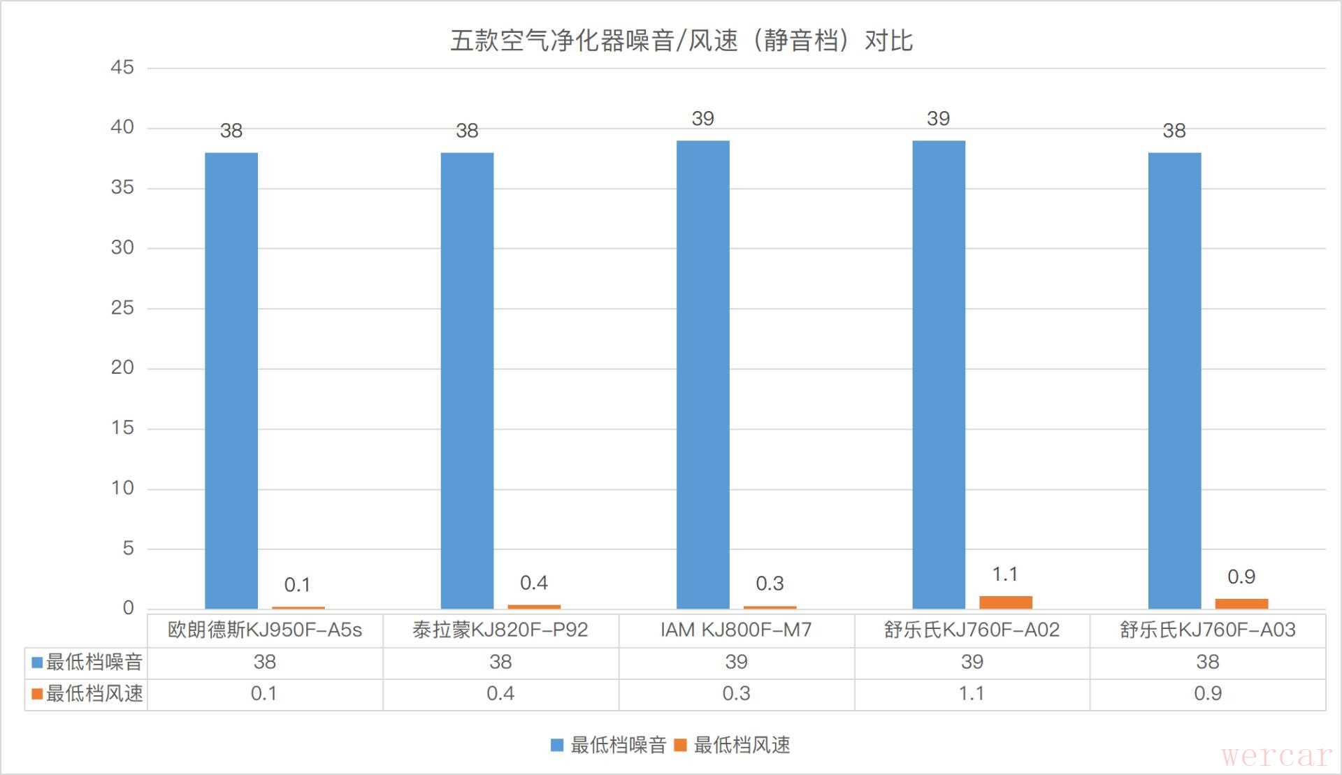 在其他方面,我们还分别对这五款产品最大档和最小档下的噪音和风速进行了实测。先来看静音档下的噪音数值,五款产品的表现基本一致,身体感受是几乎听不到噪音的。而在静音档下的风速检测中,舒乐氏的两款是要明显高于其他三者的,这三款的风机是极慢极慢的转动状态,这种速度下能有好的净化效果才怪呢。