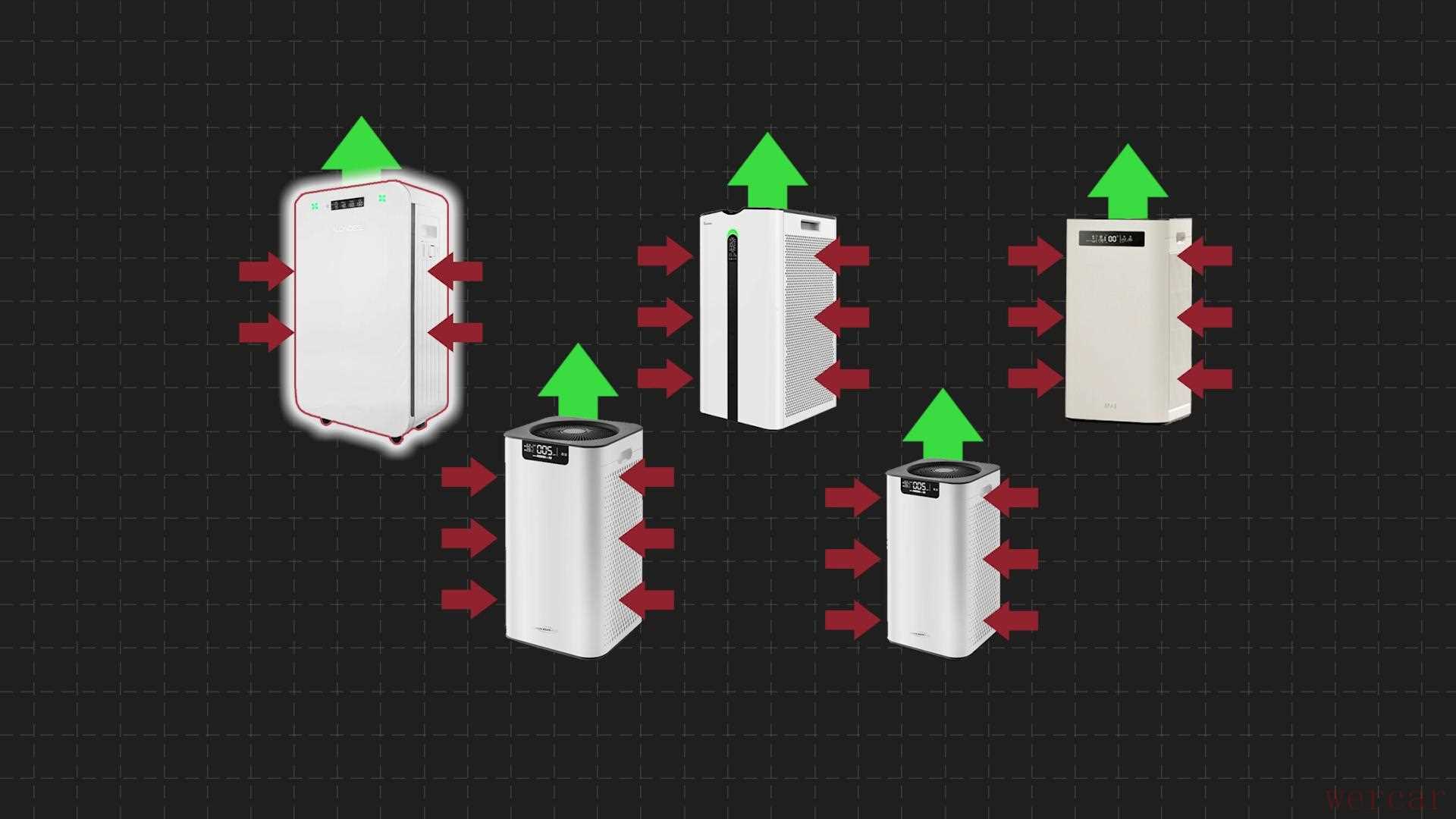 接着再来看一下这五款产品的风道设计,欧朗德斯采用的是滤网前置,两侧狭小的进风口进风,顶部出风的方案。其他四款则都是滤网置于两侧,两侧同时进风,顶部出风。从进风口的面积上来说,四款滤网置于两侧的机型肯定是要优于欧朗德斯的。