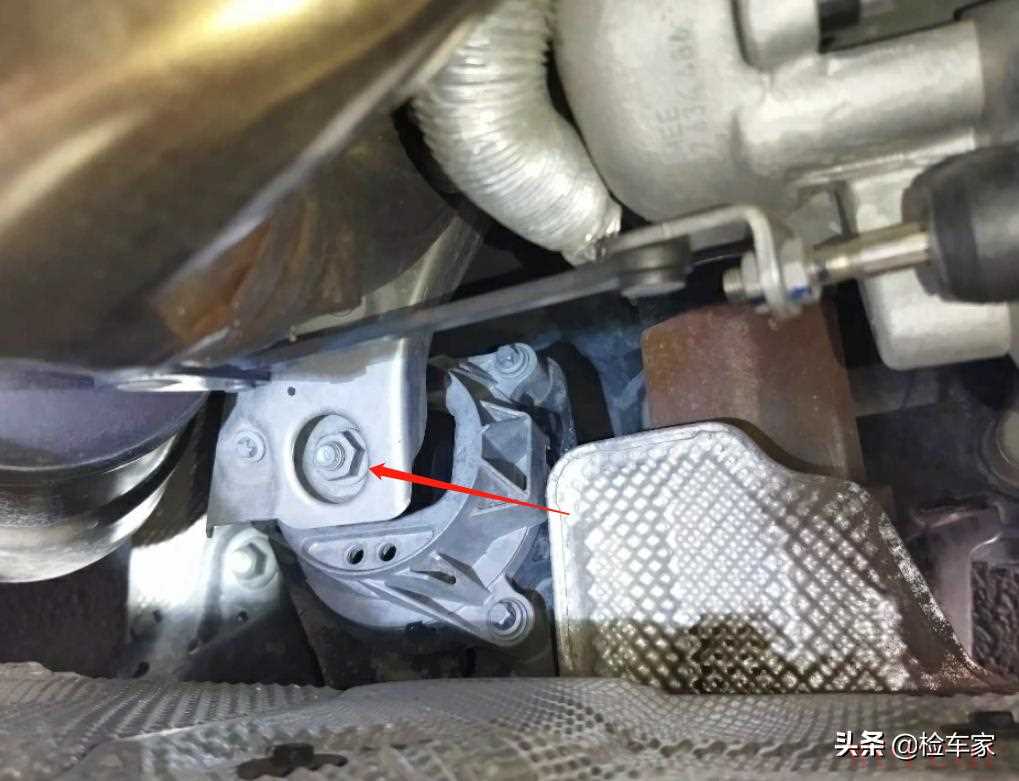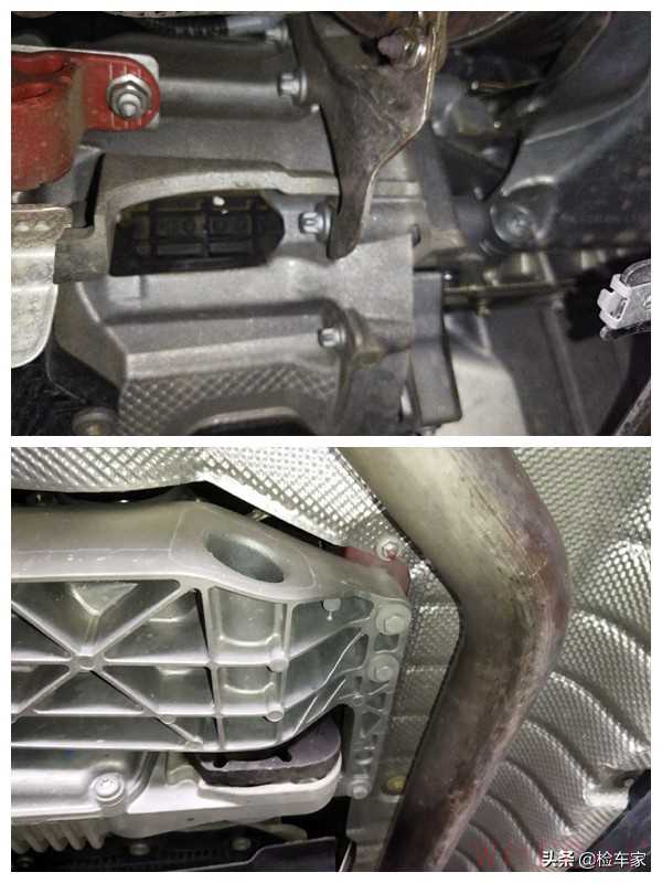 从底盘再次对发动机变速箱进行检查,可以看到发动机变速箱结合处不存在渗油痕迹,同时结合处固定螺丝也不存在拆卸拧动痕迹,可以确定发动机变速箱为原厂,无分解维修;变速箱机脚螺丝目前也为原厂状态,螺丝无拆卸,胶套无老化,可以排除变速箱吊装嫌疑。