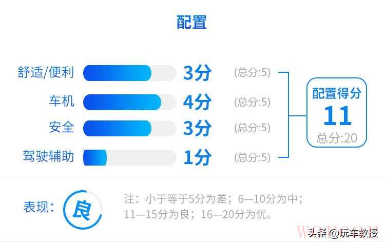 配置小结:通过评分我们也可以看得出来,奕炫GS在舒适/便利、车机、安全方面有着不错的表现,但是在驾驶辅助方面得分较低,受制于定位和成本的原因也是可以理解,所以综合这些方面的表现,奕炫GS的配置得分可圈可点。
