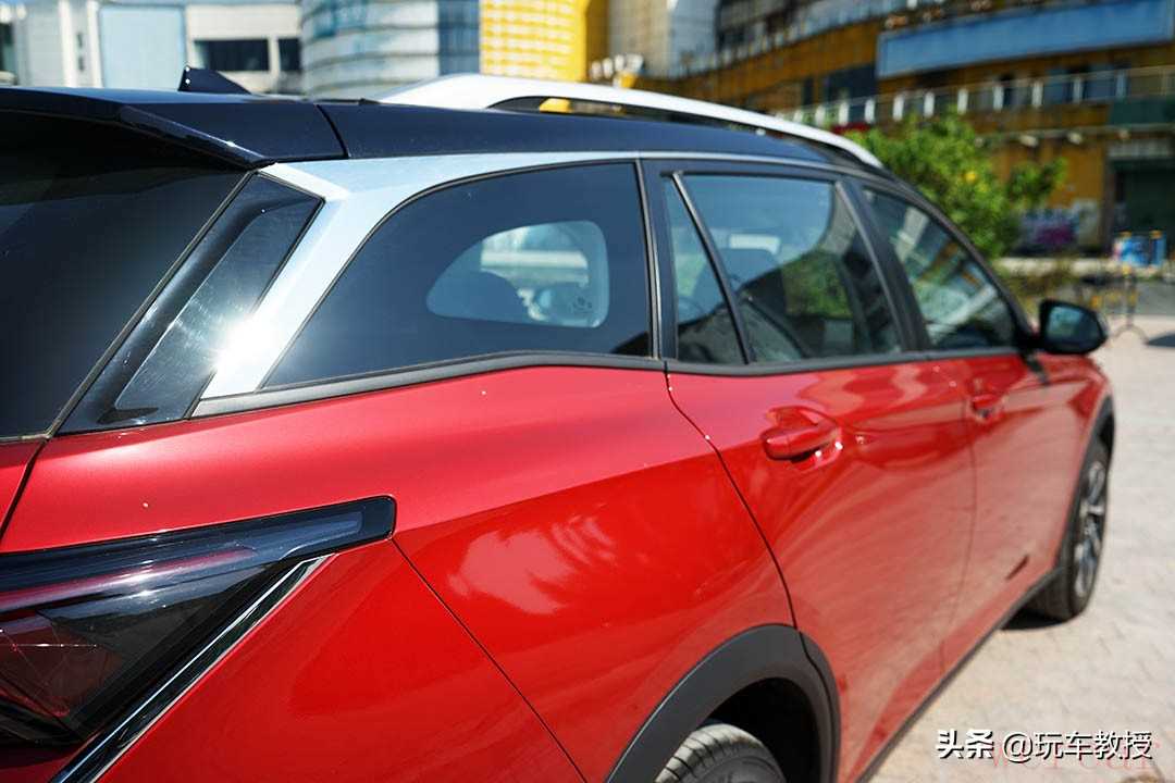 侧面的线条十分流畅,新车采用了红黑双拼的设计,强烈的颜色反差营造了不错的视觉效果,并且在D柱的位置上还有银色的镀铬点缀,整体看很有跨界SUV的味道。