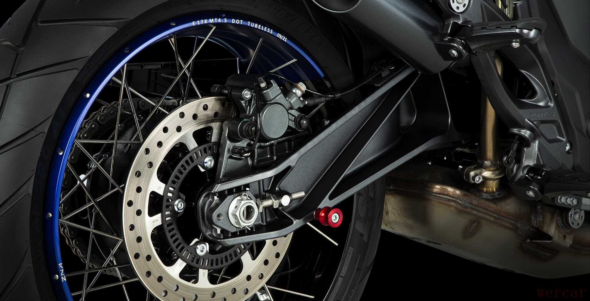 减震系统配备前43mm倒置减震,后中置减震采用了50mm直径内充高压氮气的配置,官宣称这个后减震的规格比一般公升级车型还高,这里不做评论,届时拿到试驾车咱们一试便知。