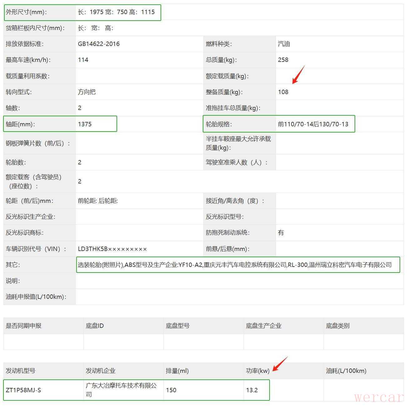 除了原创的运动化风格以外这台车还有非常出色的性能表现,从工信部申报的数据我们可以看到两个非常抢眼的数据。首先就是这台车它仅有108KG的整备质量,不得不说这样的车重就算摆在125踏板中都是非常轻的表现,看来升仕在轻量化上也是下足了功夫。