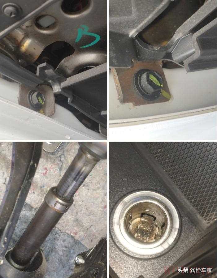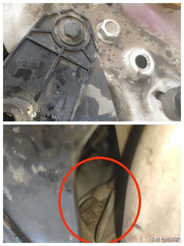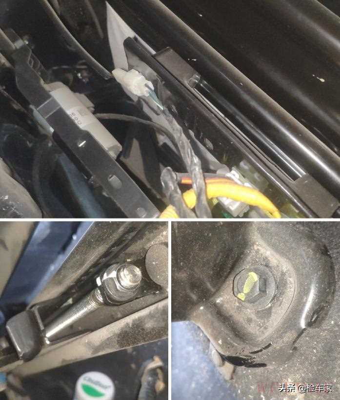 机舱部分首先检查到车头前方的水箱框架固定螺丝有过拆卸,周围的附件锁块,喇叭的固定螺丝同样有过拆卸痕迹;车头前方的防撞梁同样有过拆卸痕迹,那么可以确认,车头有过碰撞事故。