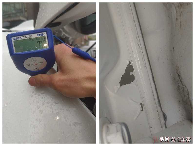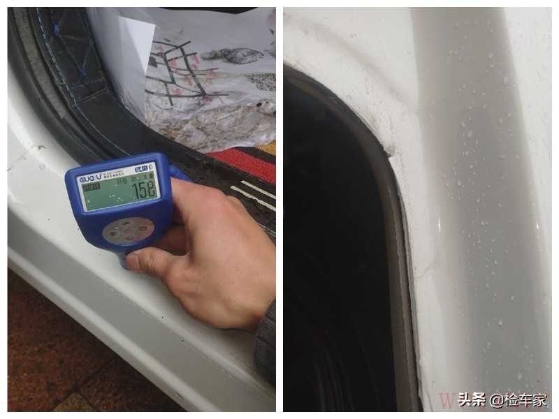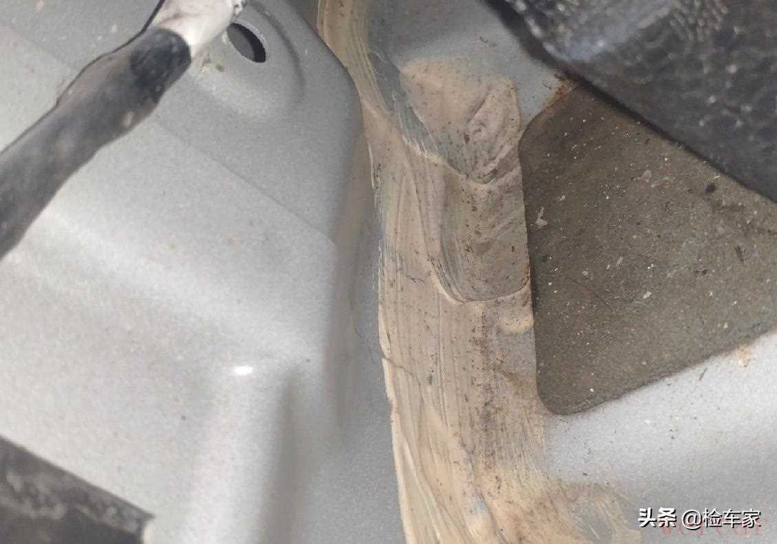 为了认证A柱切割的目的,我随后检测了左侧下边梁位置是否存在切割,通过检测左侧下边梁只是有过喷漆;但是左侧B柱能够看到上面刮有腻子灰且刮得不是很均匀,凹凸不平。