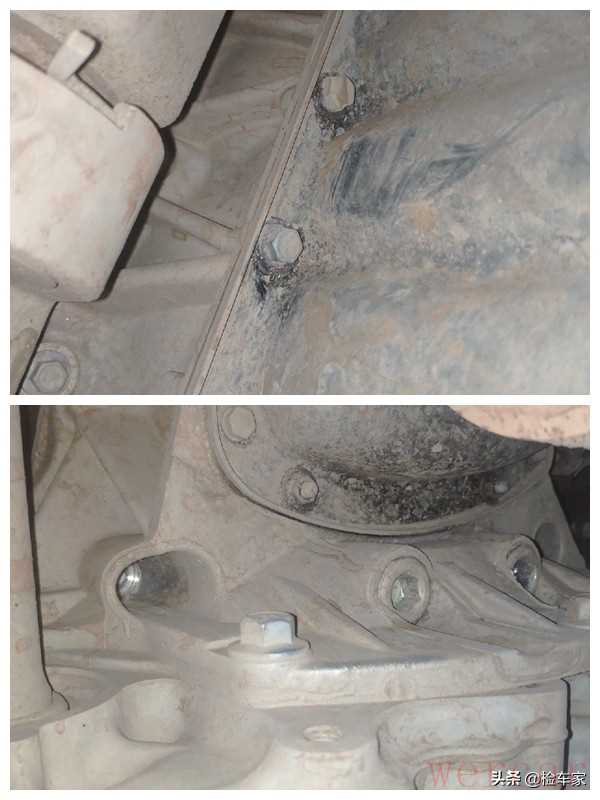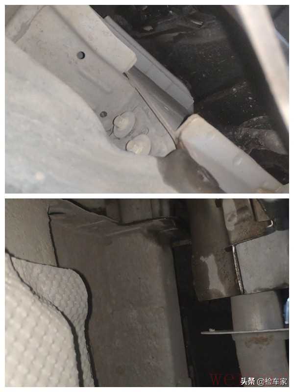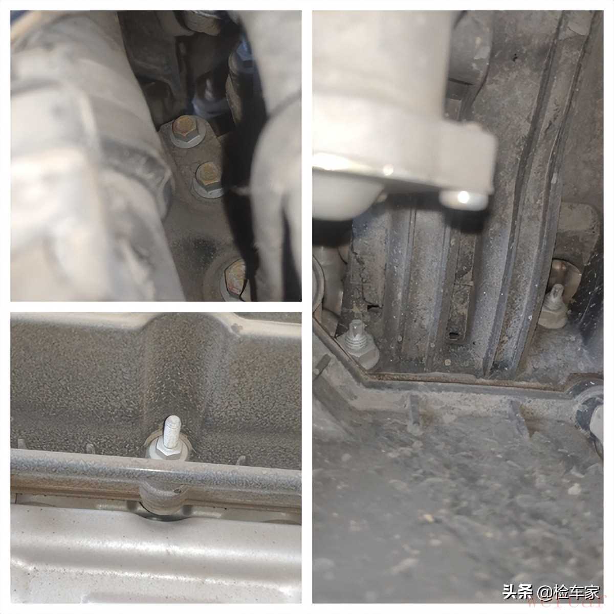 然后从底盘下方再一次检查发动机变速箱,可以看到发动机下方的油底壳固定螺丝没有拆卸拧动痕迹,发动机与变速箱连接处的螺丝没有存在拆卸拧动痕迹,可以确定发动机与变速箱是没有存在吊装分解维修过的,底盘部分也没看到明显的渗油漏油痕迹。所以现在咱们国产车的三大件确实也跟上节奏了,质量还是挺不错的,就是性能上或多或少有点差距。