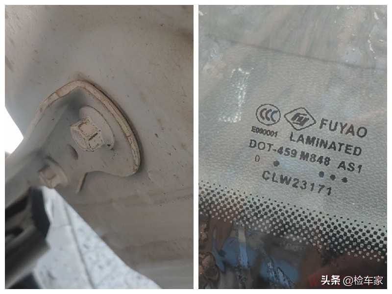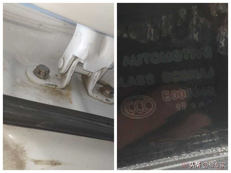 既然事故都已经撞到内侧了,那么左侧两个门肯定也都是保不住的。检查发现左侧两门固定螺丝以及限位器螺丝都是有过拆卸的痕迹的;且左侧门玻璃生产日期为2017年,与车辆日期不符存在更换,而且换的还是拆车件。