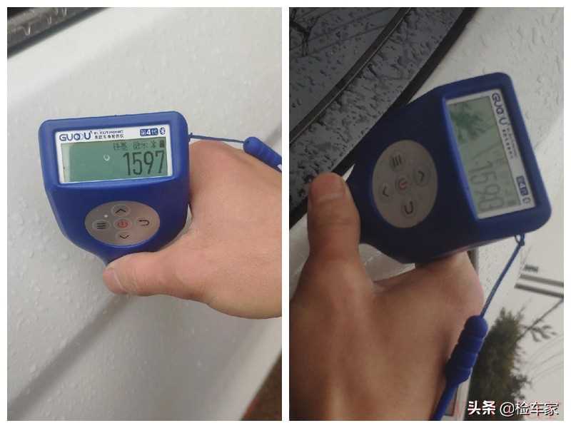 随后又检查到引擎盖固定螺丝有过拆卸拧动痕迹,且漆面数值高,存在钣金喷漆;前挡风玻璃生产日期为2020年,与车辆出厂日期不符,存在更换。那么从目前车头的情况来看,有很大的几率是有过碰撞的,待会儿再来仔细研究,先来看看车身其它部位的情况。