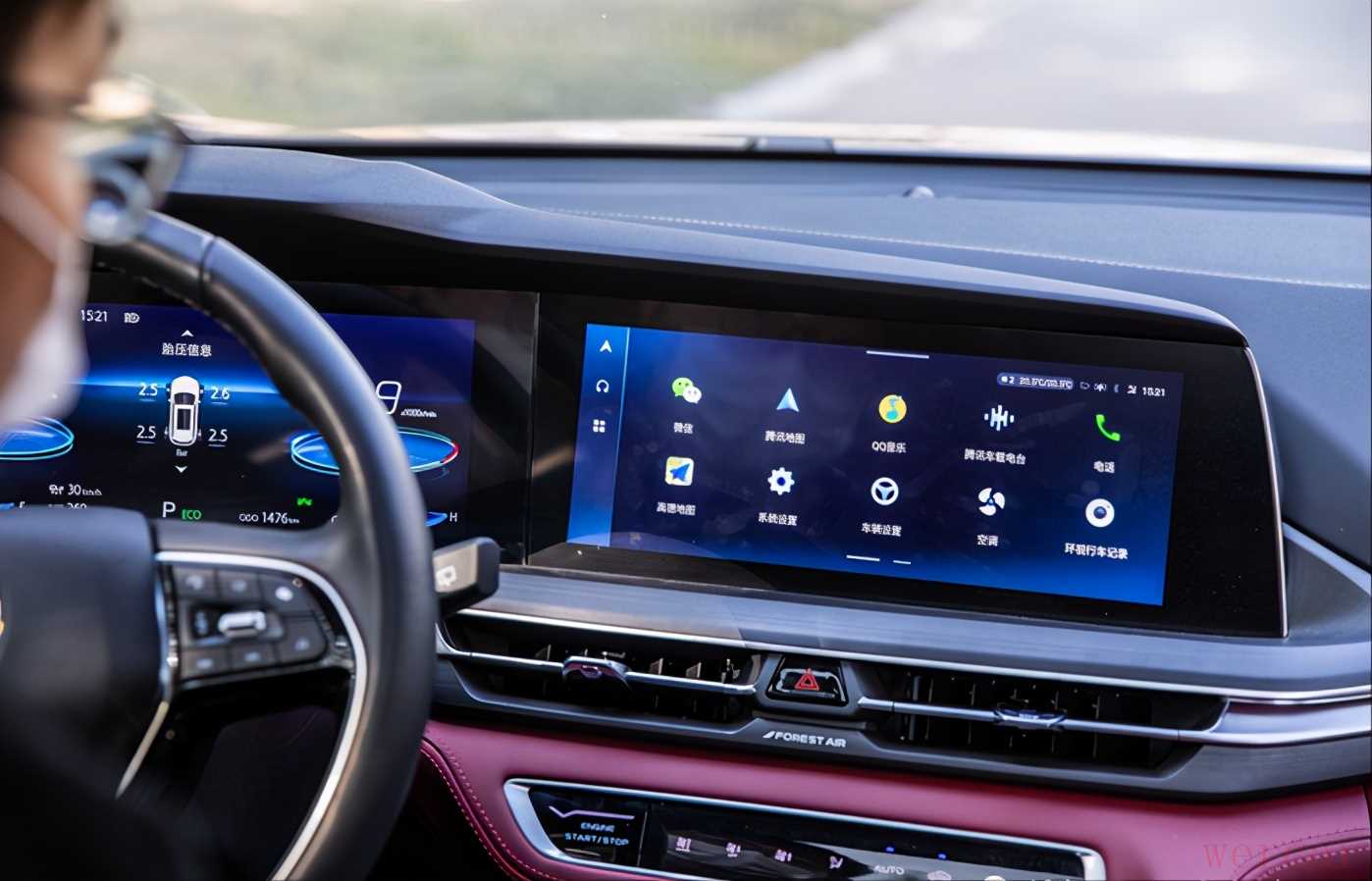 除去用料厚道,缝线工艺优秀之外,这台车的车厢科技感也营造得不错。双连屏虽然不是什么标新立异的设计,但屏幕的显示色彩丰富度,以及UI风格设计很符合我的喜欢,布局色彩即亮眼又不显得繁杂,有种成熟大厂的设计风范。