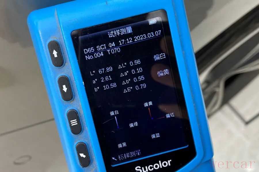 别看是二手车,但都是原版原漆,因此经过测试,最大色差值位于前杠皮处,色差值为0.79ΔE,比基准点偏白偏黄。从数值上来看,这辆车的喷漆工艺质量控制得还可以。