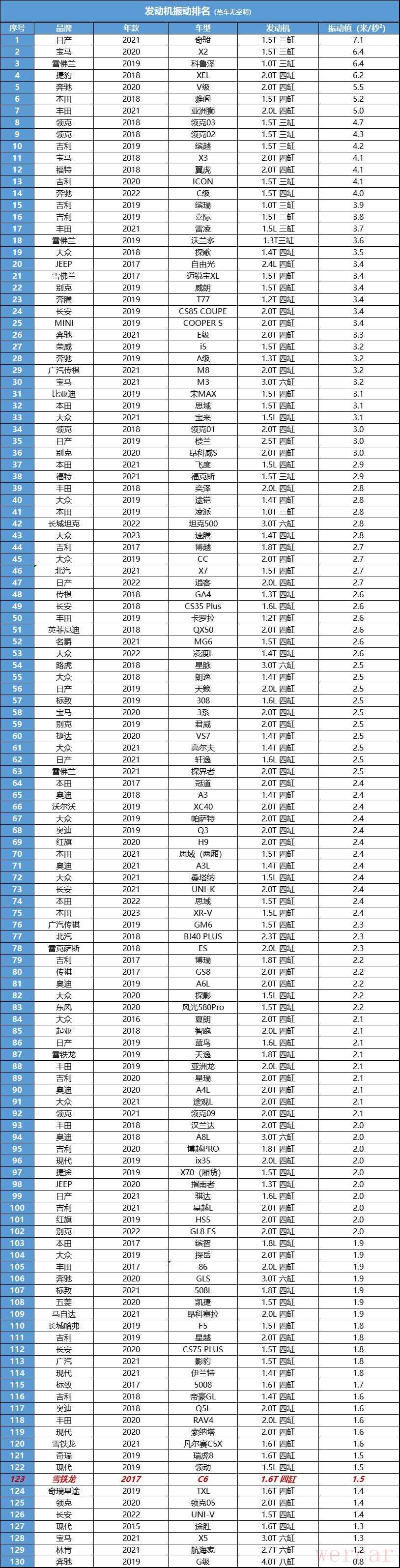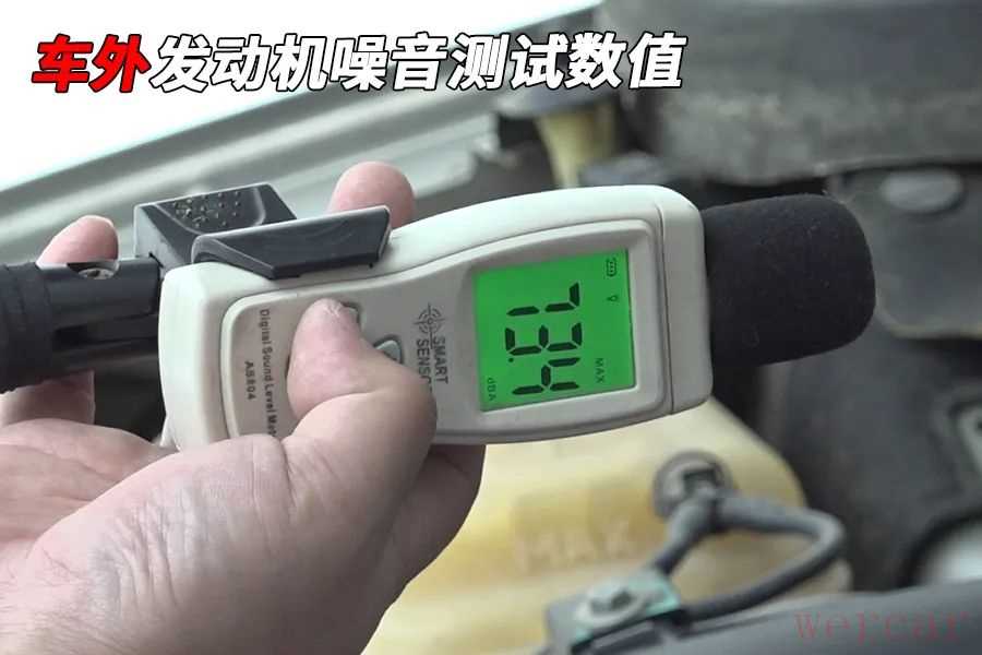 测试方法:发动机完全热机,水温正常,关闭空调,正常怠速下进行测试;打开发动机盖、取下引擎罩,在距离发动机机体上方20厘米处,进行噪音采集,取平均值,为车外发动机噪音数值(dBa);在车内,将车窗关闭,发动机空载运转2000转/分,将噪音仪置于方向盘正上方,取平均值,为车内发动机噪音(dBa)数值。并且以车内30%,车外70%的权重进行综合计算。