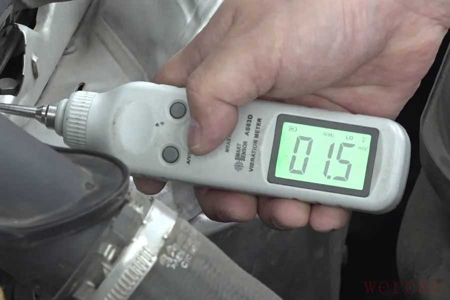 测试方法:水温正常后,关掉空调,在怠速状态下,使用测振仪垂直曲轴方向,将探针接触发动机金属机体中间的最高位置,测量发动机振动加速度值,数值越低,表明振动越小。