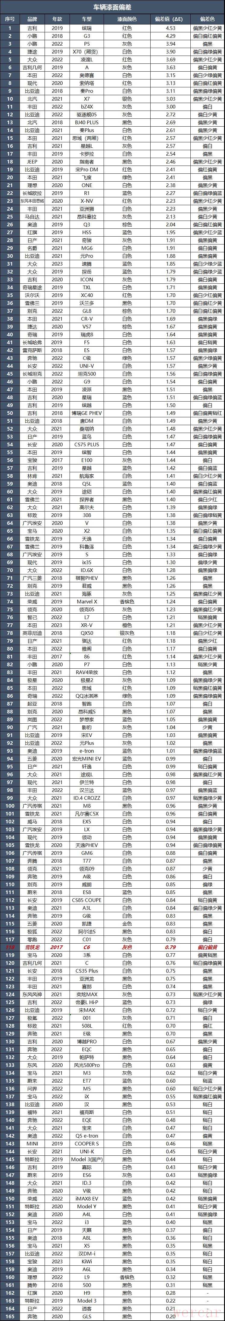 测试方法:使用色差计在引擎盖中央位置取基准数值。在车身其它位置进行对比测量,记录数值最大的位置。车身测试采样点不小于100个。