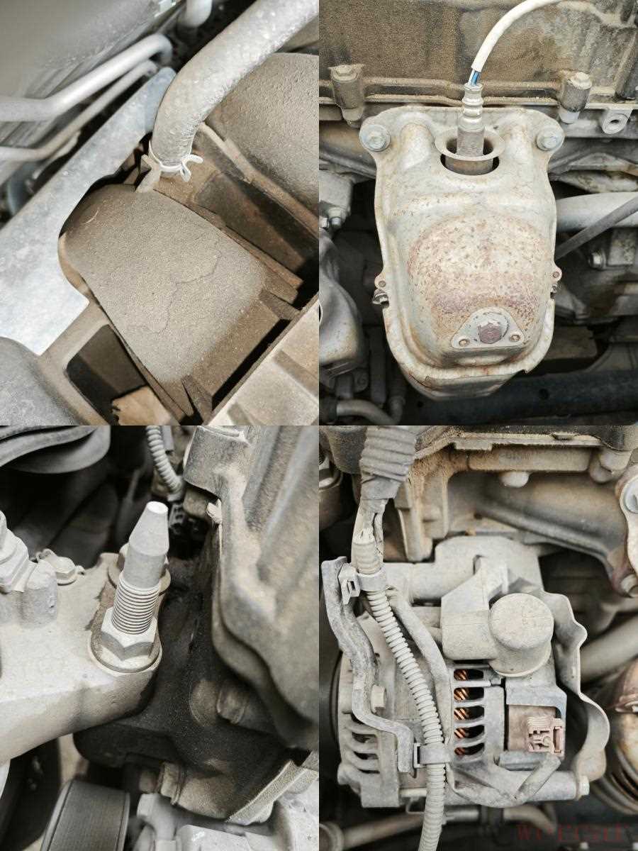 打开发动机舱,里面没怎么收拾,表面一层灰尘,发动机气门室盖也能看到明显的漏油痕迹。