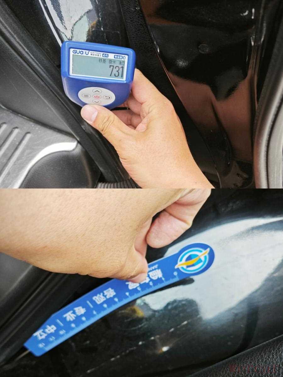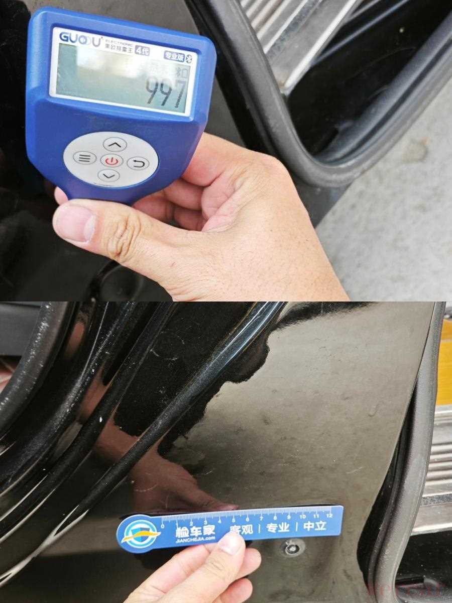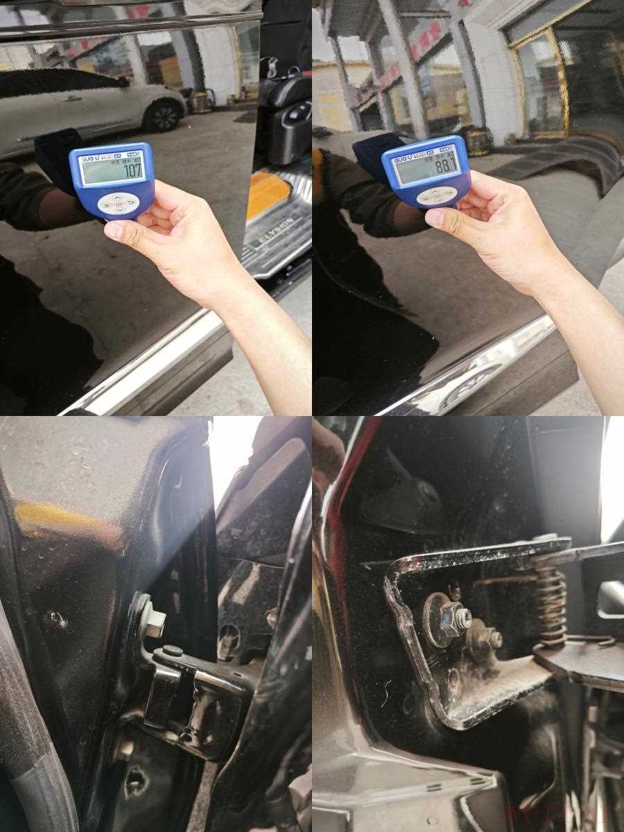 往后看车身漆面,日系车的车漆,一如既往的薄!左侧两个车门的情况和车贩子介绍的一致,外侧漆面厚度偏高了,内部铰链螺丝有拆卸,车门里侧也有喷漆痕迹,确定车门更换。