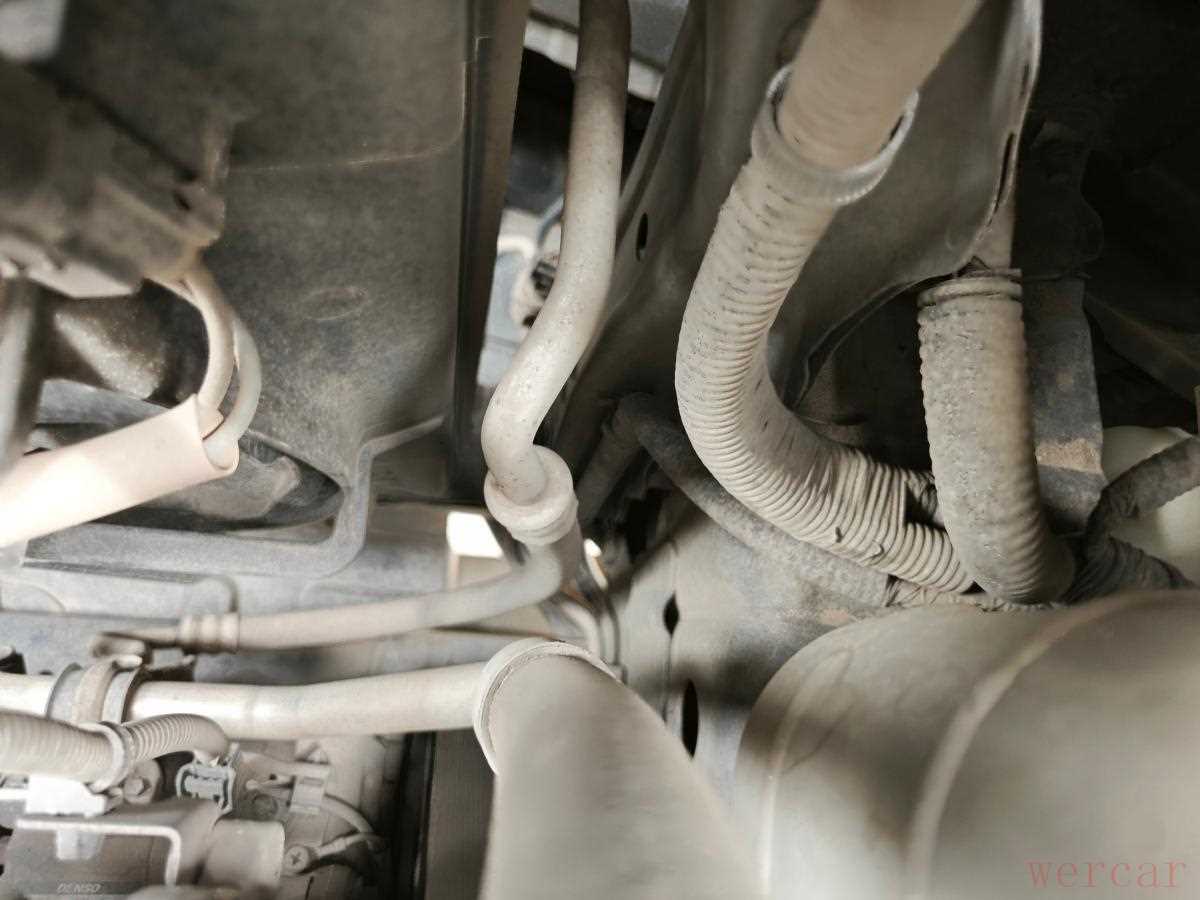 往里面看水箱框架,没有碰撞变形痕迹,也没有拆装维修痕迹,说明前面没有大的事故。