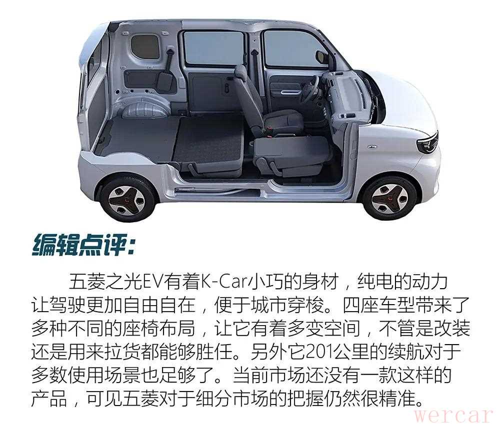 怎么样,有没有被五菱之光EV Q萌的外观和多变的空间打动呢?尤其是这多变的座椅组合给它留出了更多的可改装空间。不管是小餐吧车、萌宠护理车、咖啡车或鲜花车,搭配上它这个小巧萌动的外观,你还别说,想想都怪可爱的。所以不管是把它当做您赚钱的工具用车(具备快充,30-80%时间为0.58小时,减少等待时间)还是个性的移动小家,它都能够胜任。五菱之光EV的价格区间为4.78-5.08万元,各位想入手吗?
