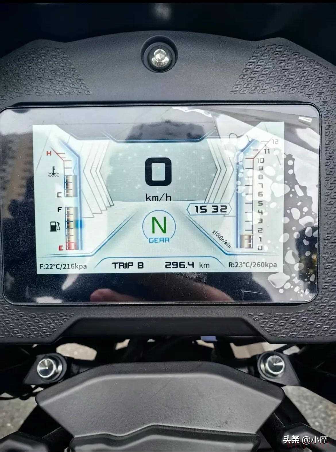 表显83公里第一格油下;136公里第二格油下;198公里第三格油下;236公里第四格油下;296.4公里油表开始闪灯,加满95号汽油花费14.98升。也就是按照贝纳利TRK552公路版油箱容量20升算,油箱里还有5升油,足以再跑80-100公里,可以看出贝纳利TRK552公路版一箱油至少可以跑将近400公里。百公里油耗为5.05升。