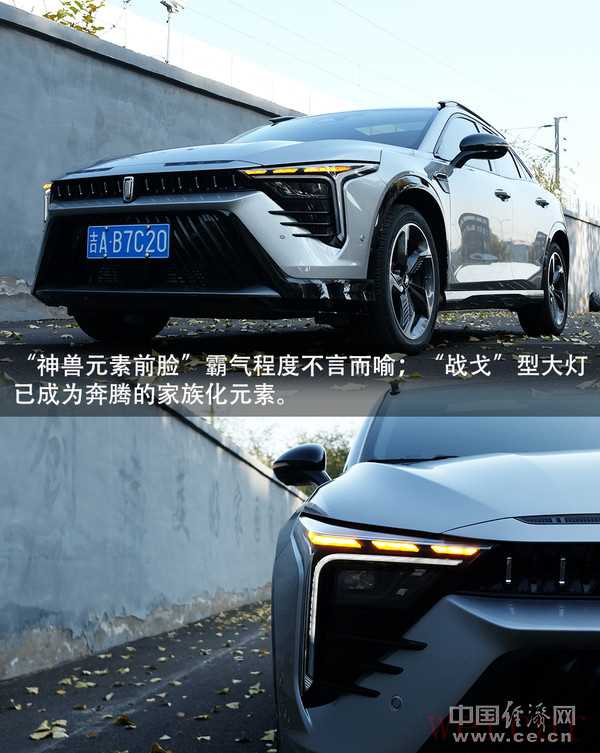 奔腾B70S的外观冲击力足以瞬时抓住消费者眼球,其并没有采用电动车时代流行的极简风,而是以复杂的元素、锋利的线条,打造出了一款战斗欲望满满的产品。从车头看去,犀利的“战戈”型2.0分体式大灯已成为奔腾的家族化元素;“霸占”前脸的硕大散热格栅也采用了分体设计,上层细长、贯穿式的部分起到了衔接的妙用,而下层巨大的梯形格栅则尽显霸气,奔腾将该款设计命名为“神兽元素前脸”,霸气程度不言而喻。