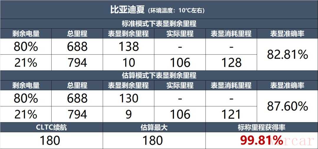 这辆车搭载了一块36.6千瓦时的磷酸铁锂刀片电池,CLTC标称续航里程180公里。在北京入春10摄氏度左右的气温下测试,充电至80%,标准模式显示续航里程138公里,动态续航显示130公里。使用纯电模式行驶到电量剩余21%时,发动机介入进入混动模式,标准模式显示可续航里程10公里,动态续航里程是9公里。标准模式表显消耗里程128公里,动态模式表显消耗里程121公里,实际行驶里程106公里。计算得出标准模式表显准确率为82.81%,动态模式准确率为87.60%,CLTC续航里程估算获得率为99.81%,到目前为止是里程最准的比亚迪车了。