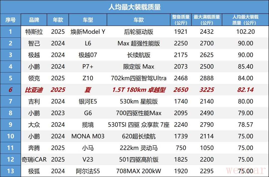 我们这辆车的整备质量为2650千克,最大满载质量为3225千克,计算得出这辆DM-i 1.5T 180km 卓越型的人均最大装载质量为82.14千克,超出标准7.14千克。
