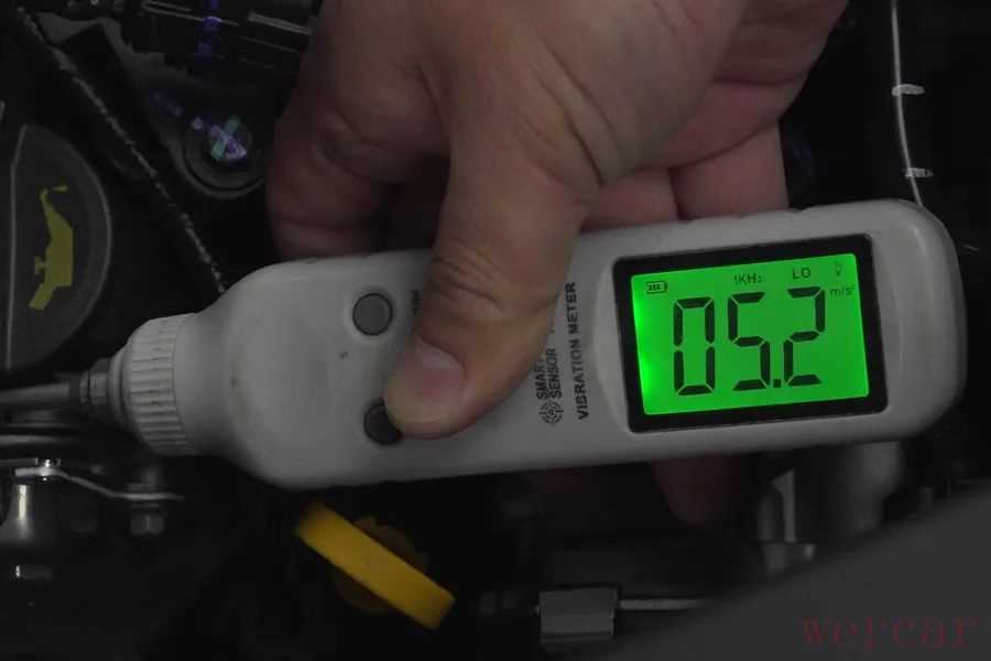 测试方法:水温正常后,关掉空调,在怠速状态下,使用测振仪垂直曲轴方向,将探针接触发动机金属机体中间的最高位置,测量发动机振动加速度值,数值越低,表明振动越小。