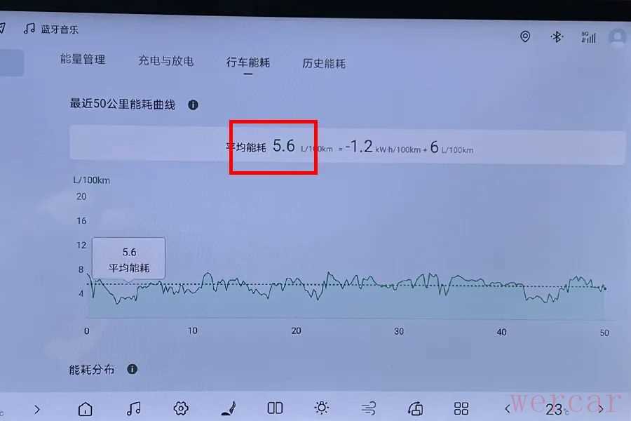 馈电混动模式下,城区道路行驶50公里的表显平均油耗为5.6升/百公里。