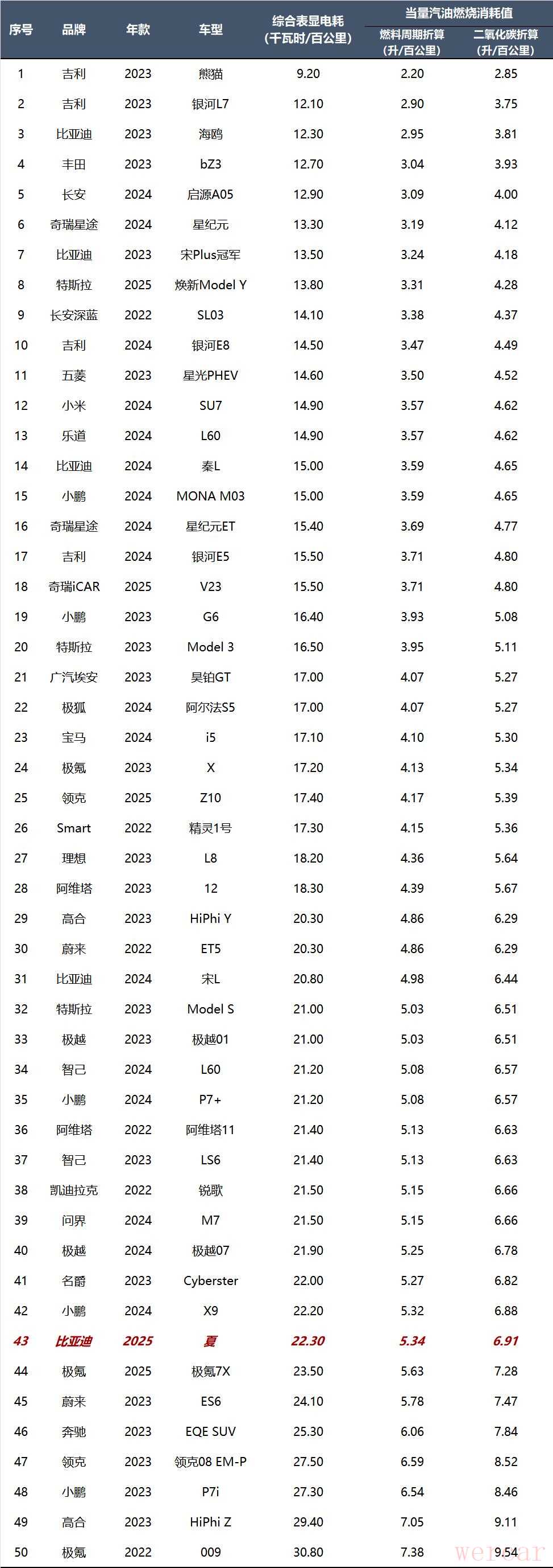 我们根据百公里耗电情况,进行电能当量燃油消耗折算,换算为“百公里油耗”。计算公式根据中华人民共和国标准《GB/T 37340-2019 电动汽车能耗折算方法》提供的“燃料生命周期法”和“二氧化碳排放法”分别进行计算。