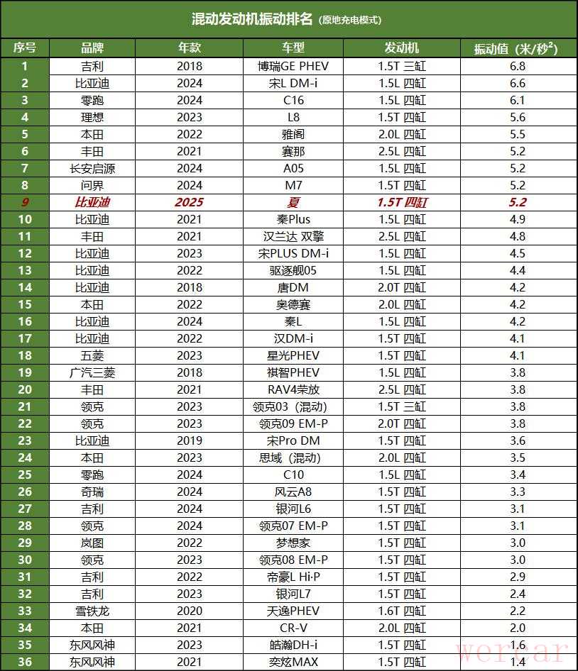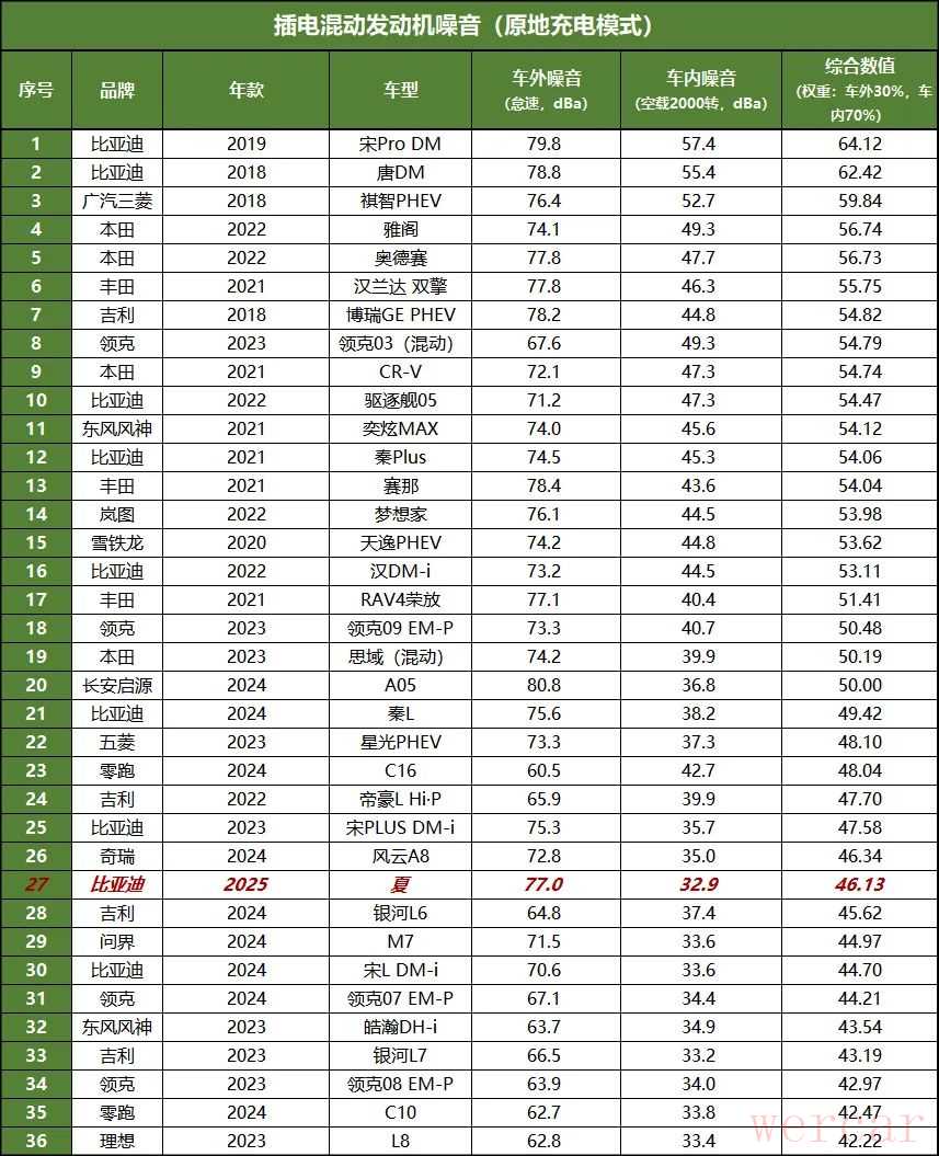 测试方法:发动机完全热机,水温正常,关闭空调,正常怠速下进行测试;打开发动机盖、取下引擎罩,在距离发动机机体上方20厘米处,进行噪音采集,取平均值,为车外发动机噪音数值(dBa);在车内,将车窗关闭,发动机空载运转2000转/分,将噪音仪置于方向盘正上方,取平均值,为车内发动机噪音(dBa)数值。并且以车内30%,车外70%的权重进行综合计算。