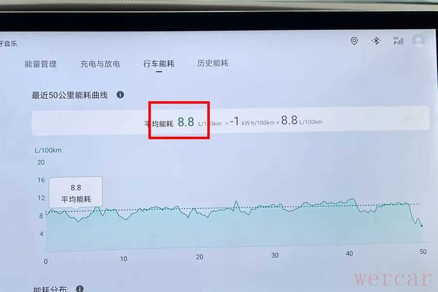 馈电模式下,在高速路行驶,50公里的表显平均油耗为8.8升/百公里。