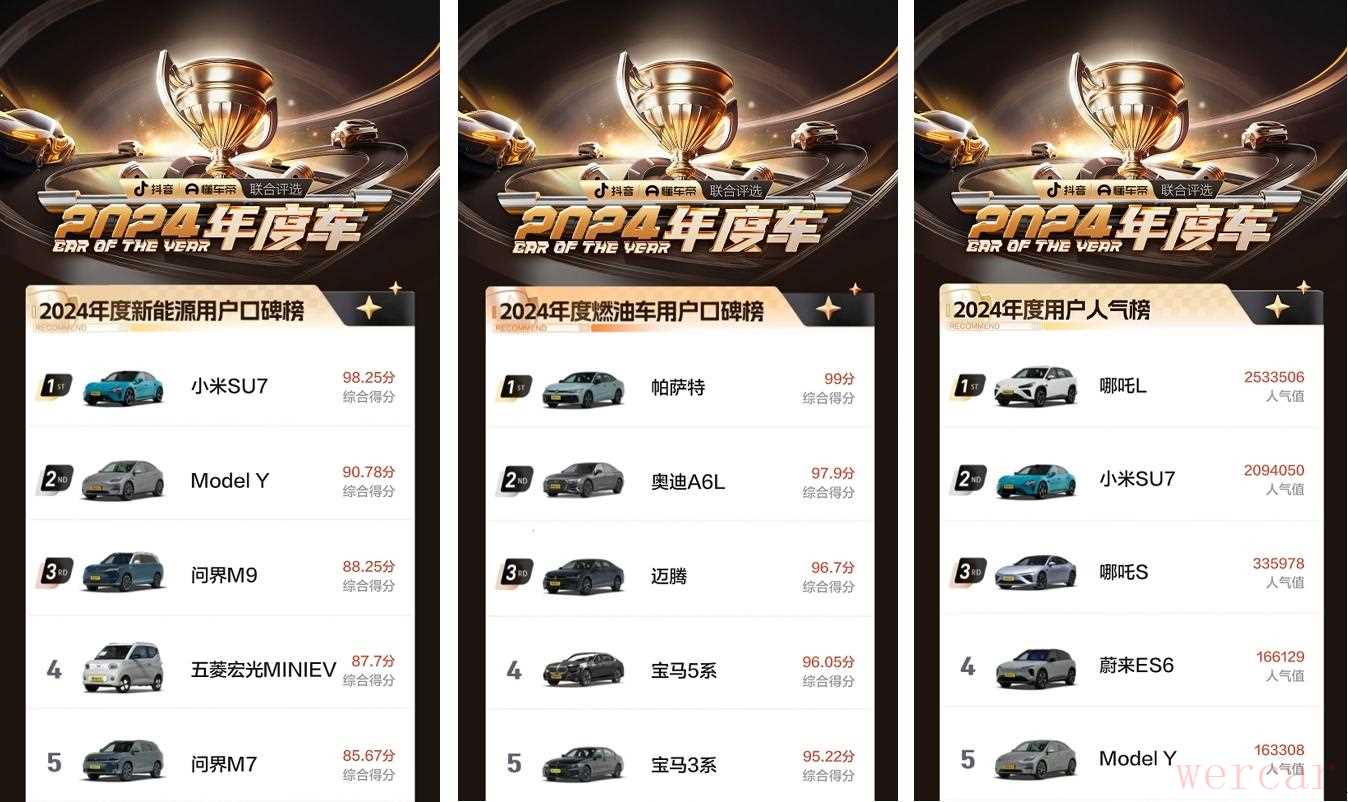 经过为期近一个月评选,抖音&懂车帝2024年度车榜单日前正式出炉。此次评选基于两大平台3.6亿深度汽车兴趣用户的真实口碑、用户投票以及实测成绩、市场销量等多重因素,共设置年度用户口碑榜、年度实测榜、年度销量榜共三大类七项榜单。最终,小米SU7、大众帕萨特、问界M9、特斯拉Model Y、哪吒L、日产轩逸等分获不同榜单榜首。