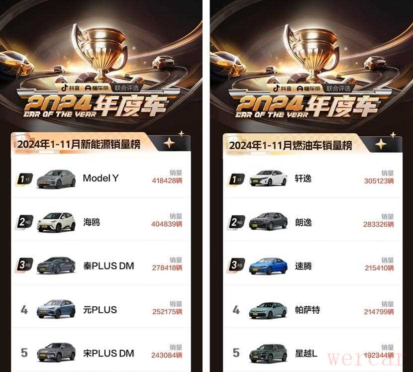 抖音&懂车帝2024年度车评选秉持“倾听用户最真实的声音”,汇集海量用户主动关注、真实口碑、选择倾向等综合因素,以精准全面的数据分析,精心甄选 “年度车”,为消费者购车提供权威参考。其中,年度用户口碑榜设置新能源品牌用户口碑榜、燃油车品牌用户口碑榜、用户人气榜。