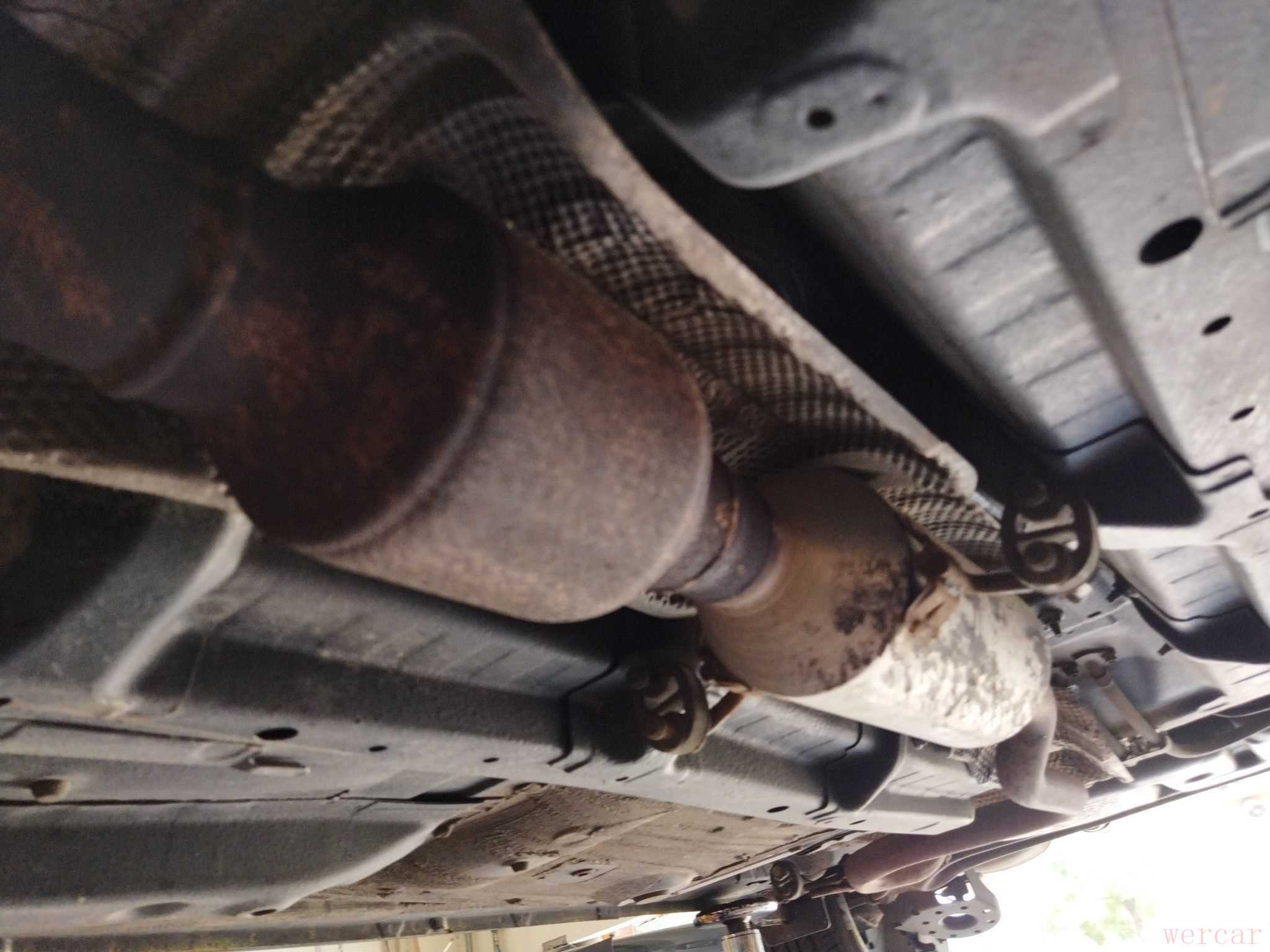 将底盘升起来,可以看到排气管上面遍布锈迹,再联想到发动机表面的氧化物,可推断前车主的用车环境比较潮湿!当然长年累月的露天停放也会产生这种现象!