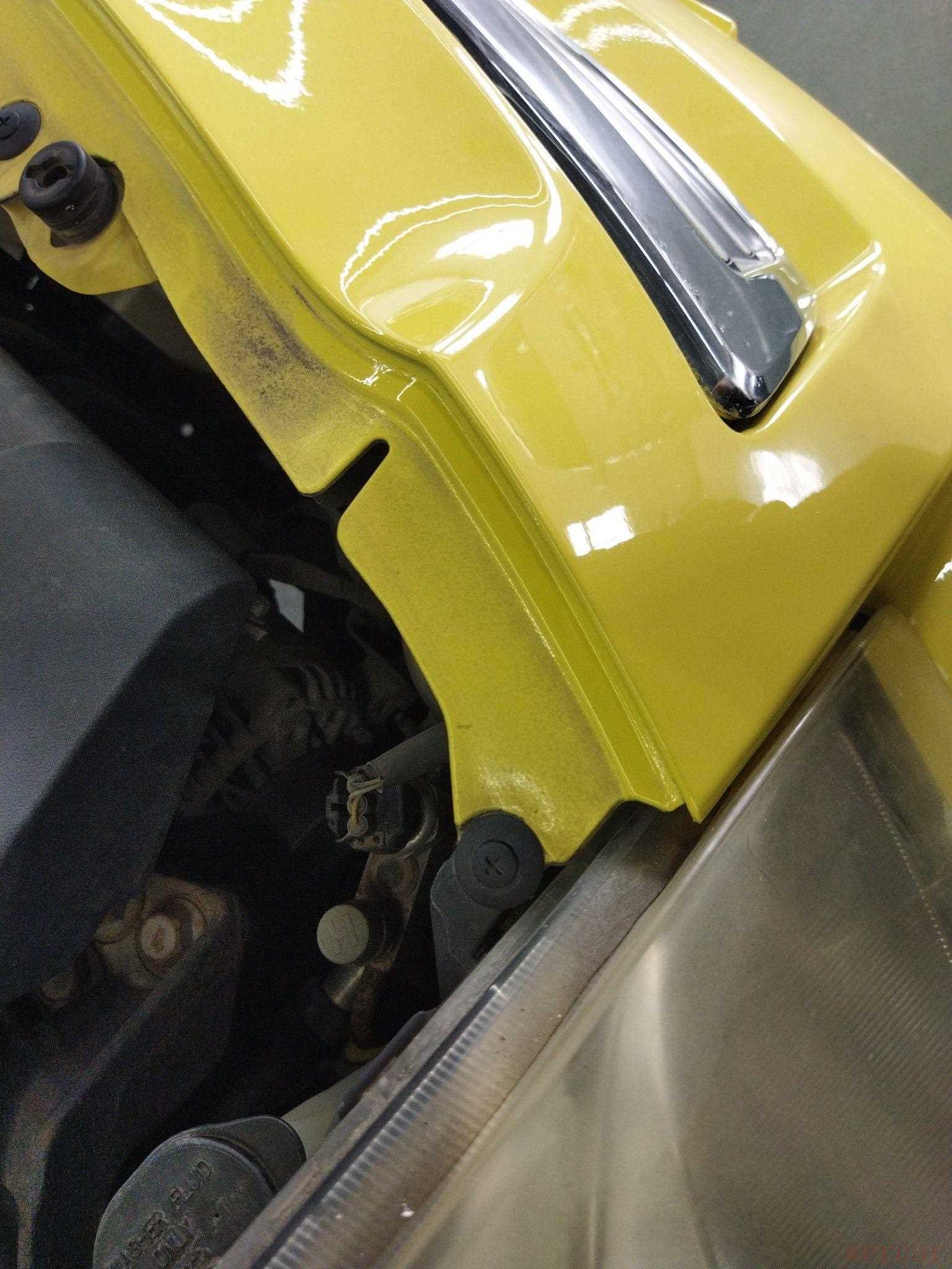前杠喷漆更换,内侧边缘喷漆的橘皮纹很明显,固定螺丝和塑料卡扣也都是拆过的!