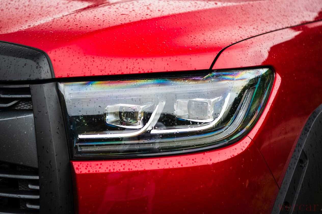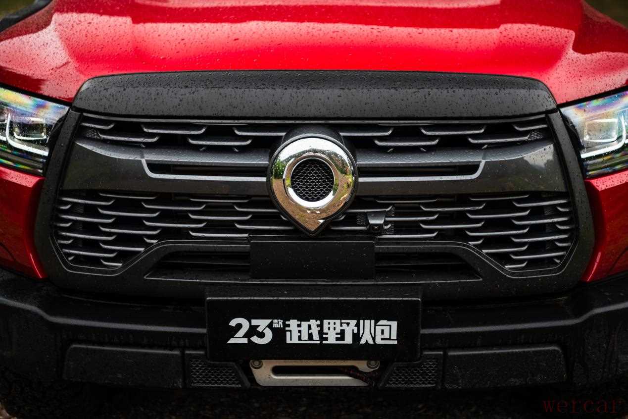 外观方面,2023款越野炮基本没有什么改变,依旧采用了硬朗、充满力量感的造型设计,大尺寸熏黑冠军腰带中网搭配豹眼式双透镜LED熏黑大灯,看上去霸气十足。