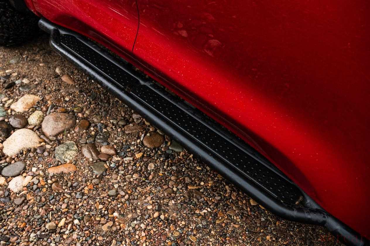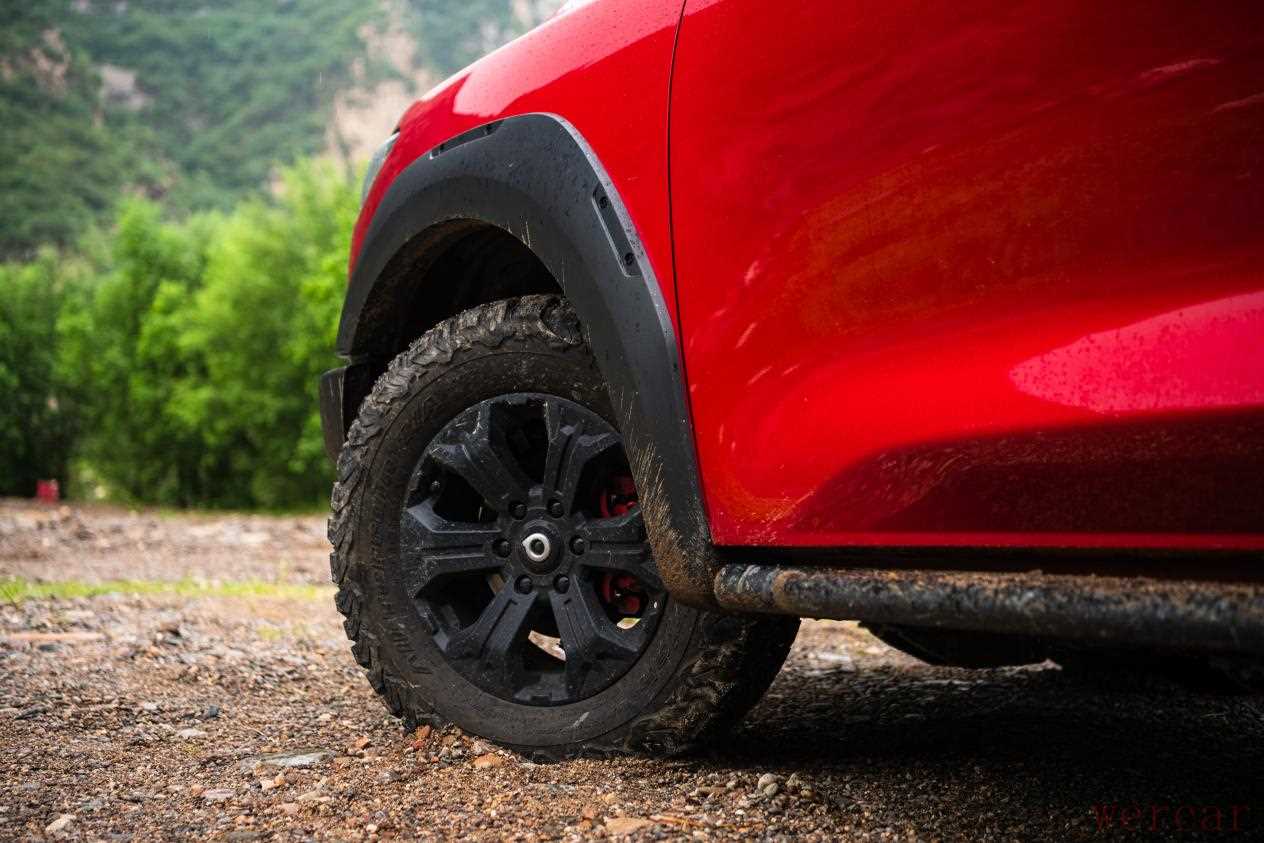 车身侧面,新车配备了涉水喉、黑色防擦轮眉、金属侧踏板、18英寸黑色轮圈和红色制动卡钳;轮胎配备的是百路驰KO2 全地形胎,不仅极具硬派气息,还可以进一步提升车辆的越野、涉水能力。