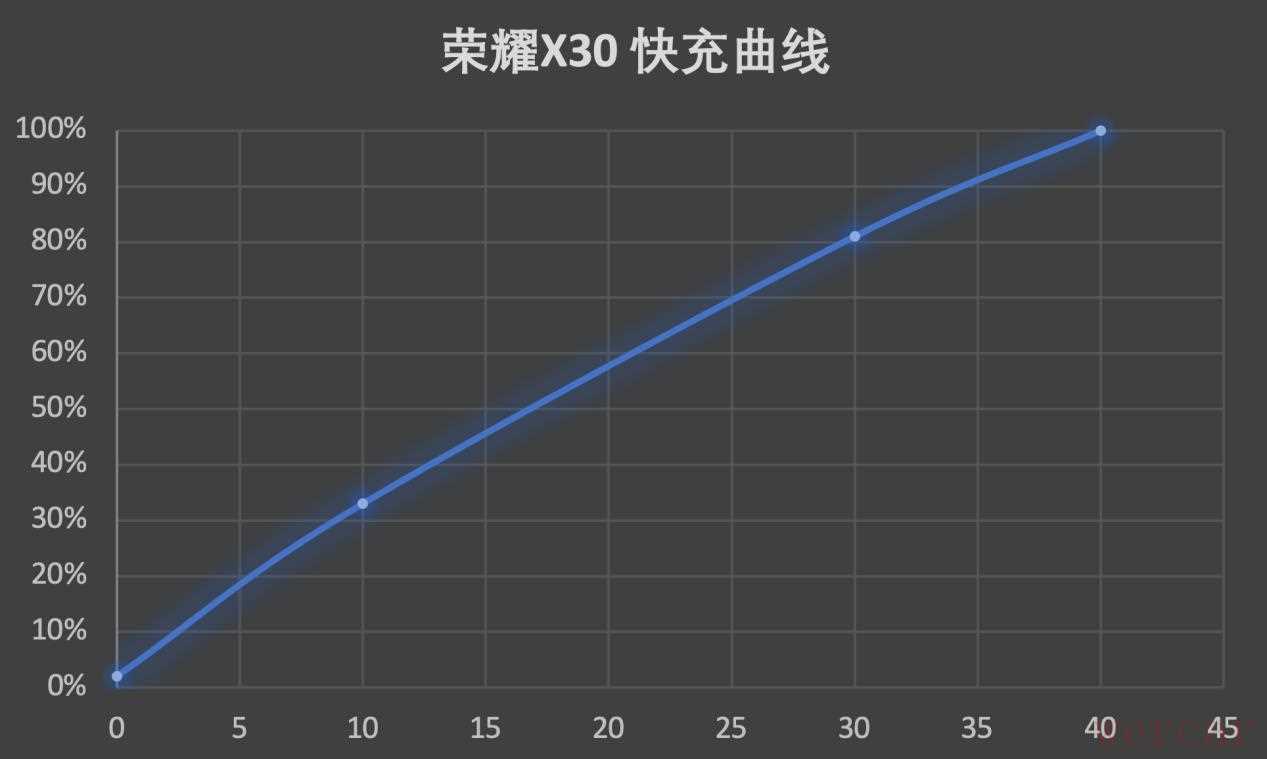 充电方面,根据官方数据,荣耀 X30 30 分钟可充电到 81%,充满仅需 43 分钟。