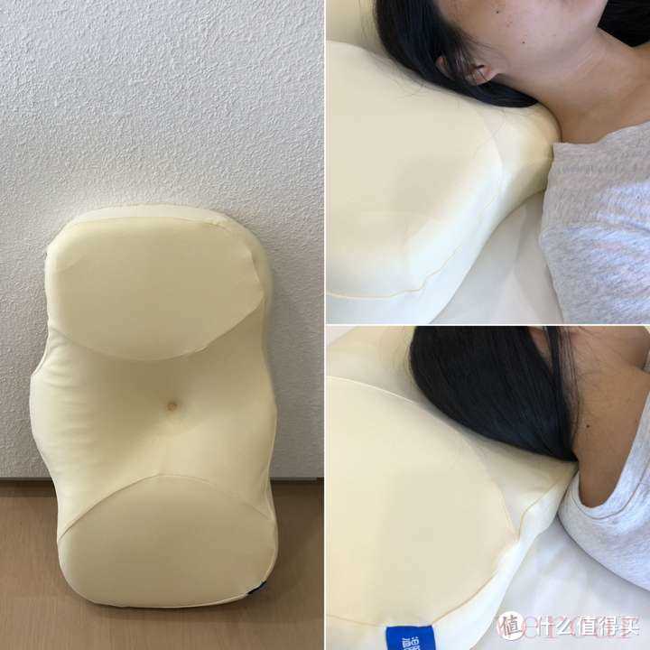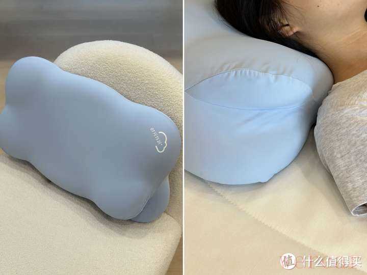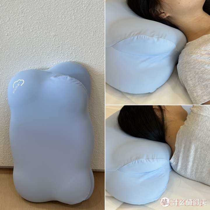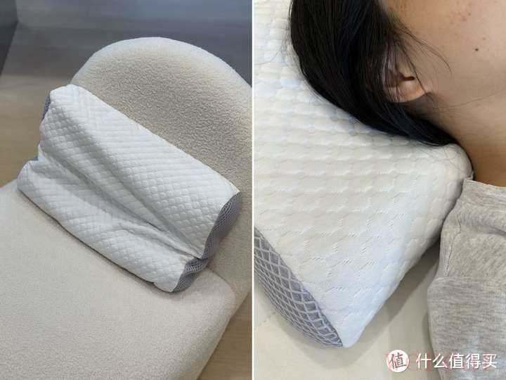 首先是它的专利云翼设计(有双设计专利),可以很好地承托侧睡时的手部,恰到好处的支撑以及设计,让侧睡时,能感觉更安心,入睡时间更快,加持4分区设计,分为是颈椎支撑区/脑窝区/耳窝区/侧睡区,每个部位都能承托地很到位,跟脖子的贴合是刚好的,图中的妹子165、97斤觉得低枕刚刚好,记忆棉也有的回弹性,可以释放工作了一整天的疲倦。