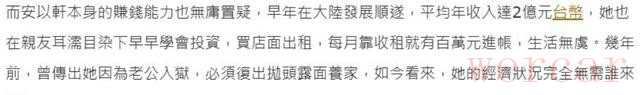 说到安以轩的家庭,现在大家才发现,她爸做生意多年,有公司在,安以轩自己没拍戏那几年也能靠投资赚不少。月入百万对她这家人来说,变换一下生活节奏很容易。“即使遇到家庭变故,她还是能保持经济独立,不会一夜之间跌到谷底。“