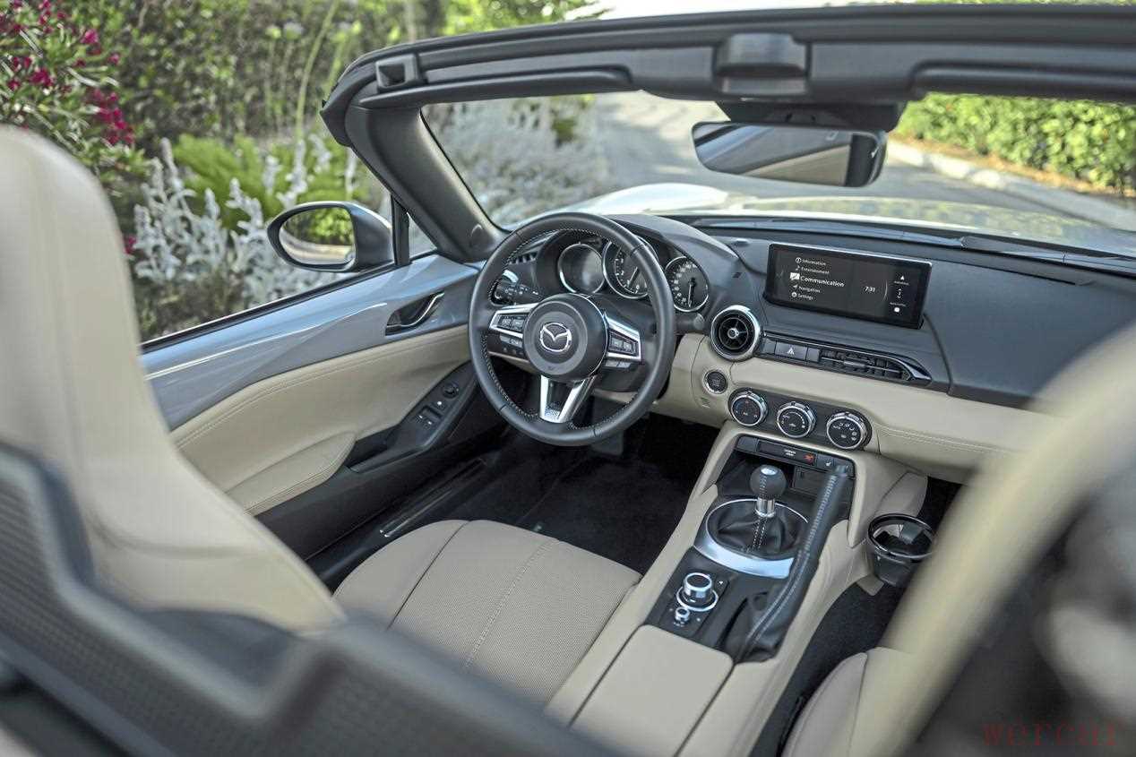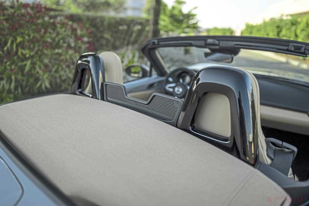 在内饰方面,车内空间足以容纳身高达到1.90米的乘客,同时提供了全新16 : 9比例的8.8英寸显示屏,支持无线连接安卓Auto和苹果CarPlay。不过,这块屏幕仅在镜像手机内容时支持触摸操作,其他情况下还是要通过按压或旋转旋钮与快捷按键控制。为了满足欧盟关于网络安全和驾驶辅助系统法规的新要求,除了改进交通标志识别功能,新车型还配备了车道保持辅助、紧急制动辅助、盲点监测、带制动功能的倒车辅助和疲劳监测等系统。虽然这些功能在一辆敞篷跑车上几乎用不上,但法规对所有车型一视同仁。此外,新车还新增了速度警告功能。不过,MX-5贴心地设计了一个按键,可以轻松关闭这项功能,让驾驶体验更纯粹。