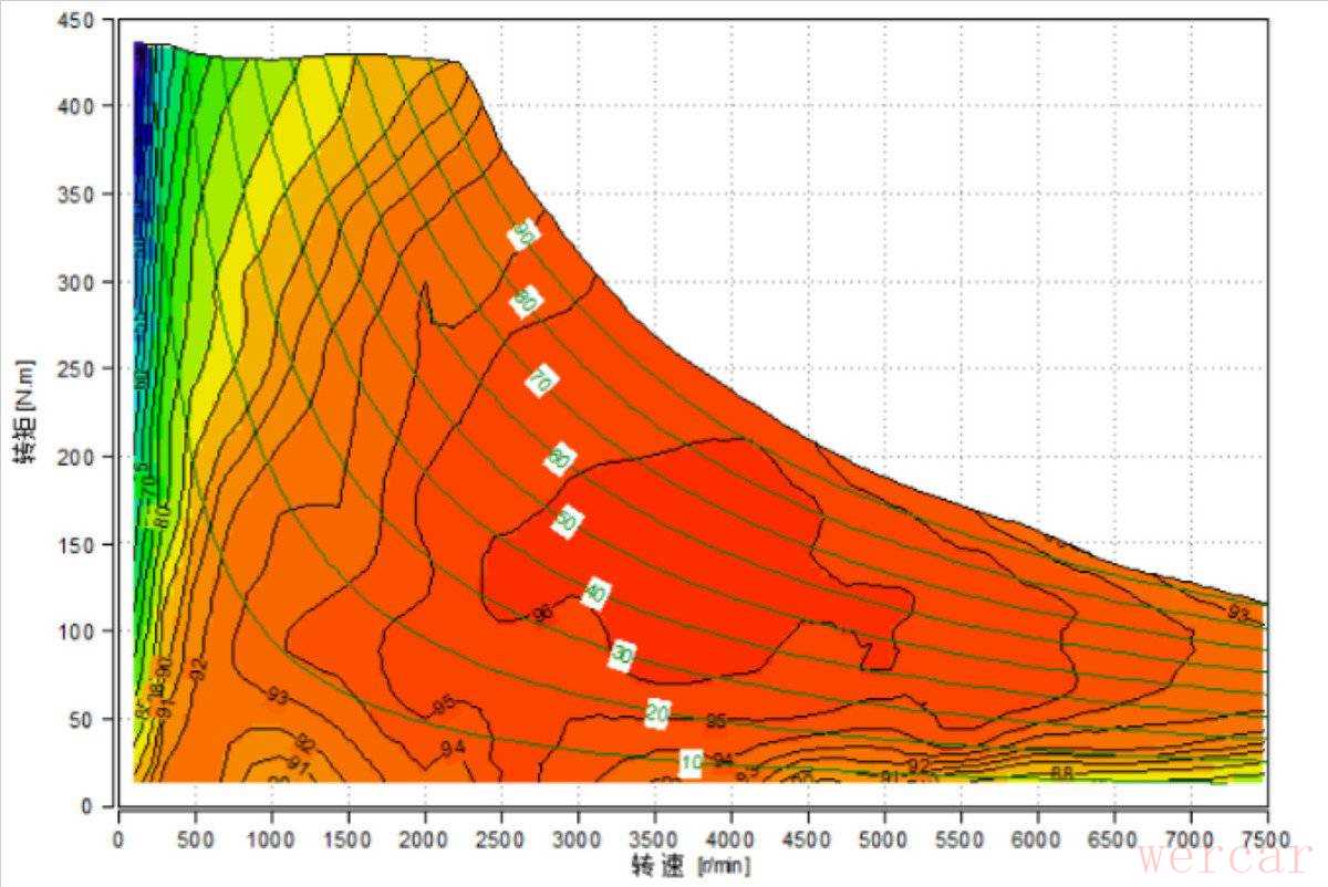 这里咱们就要聊到电机的特性了,我们都知道现在的电机效率非常高,有一些甚至可以维持在90%以上。但电机与咱们的发动机一样,也是存在着效率曲线的,下面是我们随机找到的一款电机的效率曲线。