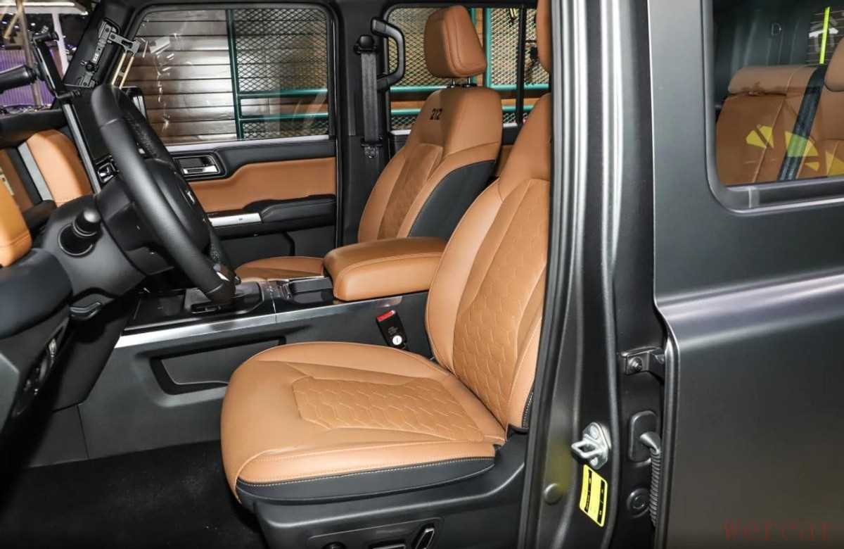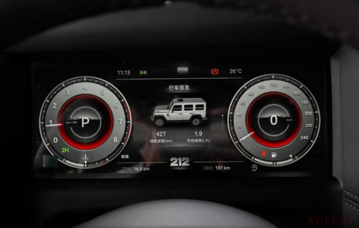 超过4.7米的车身与2.86米的轴距意味着内部空间宽敞,为了便于越野时盲操,车内保留大量物理按键。在复古的外观下,内饰并不落伍,全液晶仪表、12.3英寸悬浮式中控屏、语音控制、4G车联网、百度地图、OTA升级、手机APP远程控制等都是标准配置。