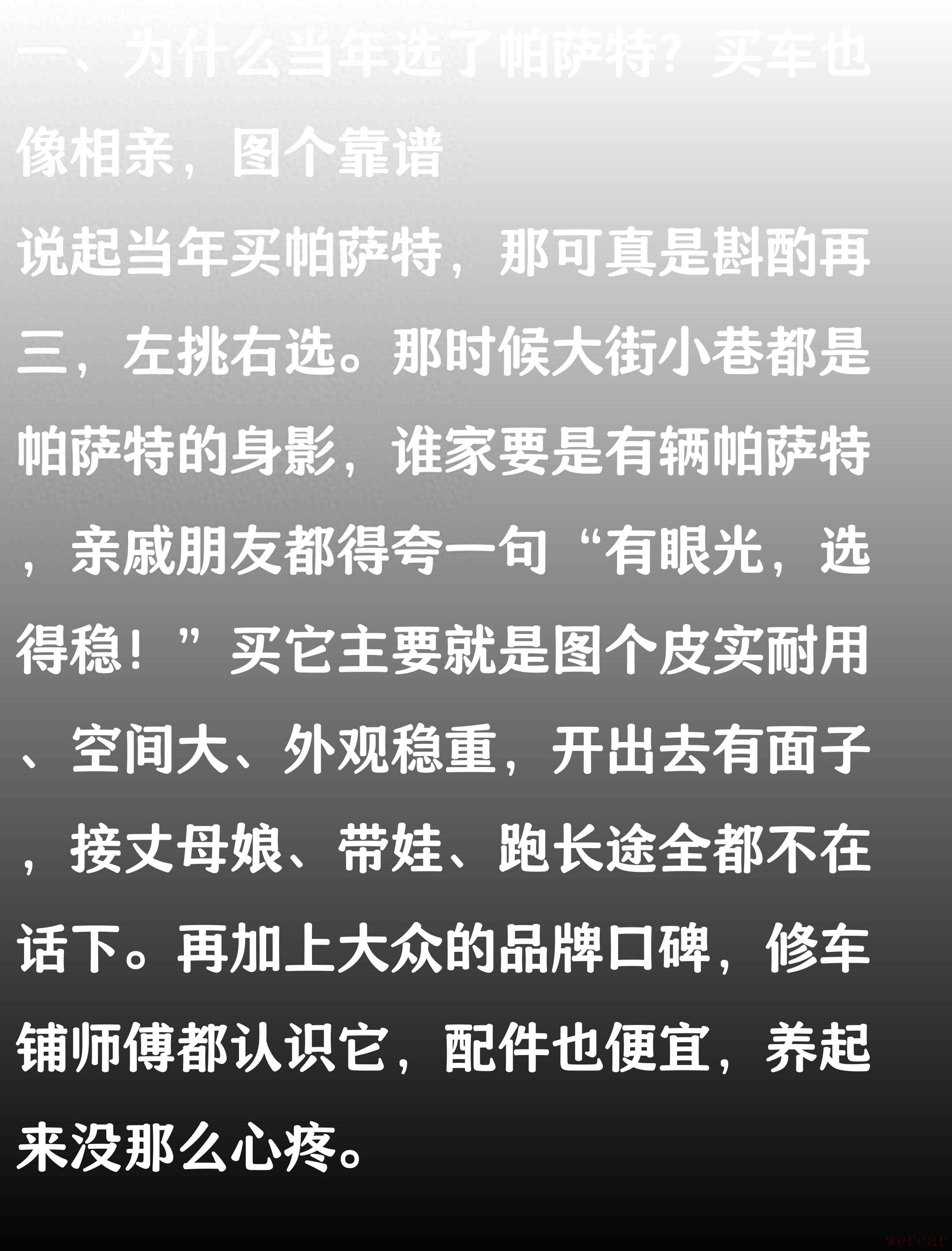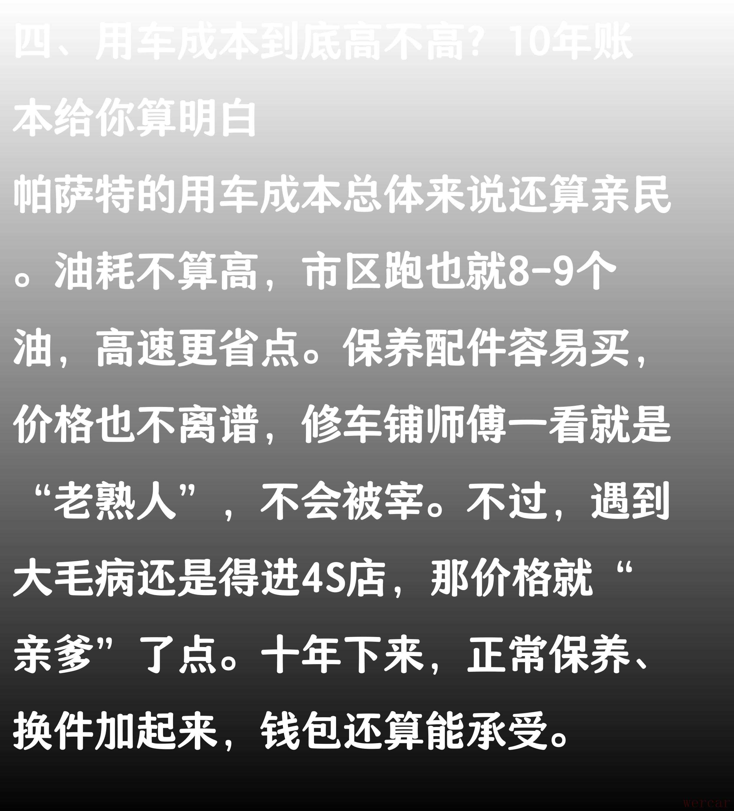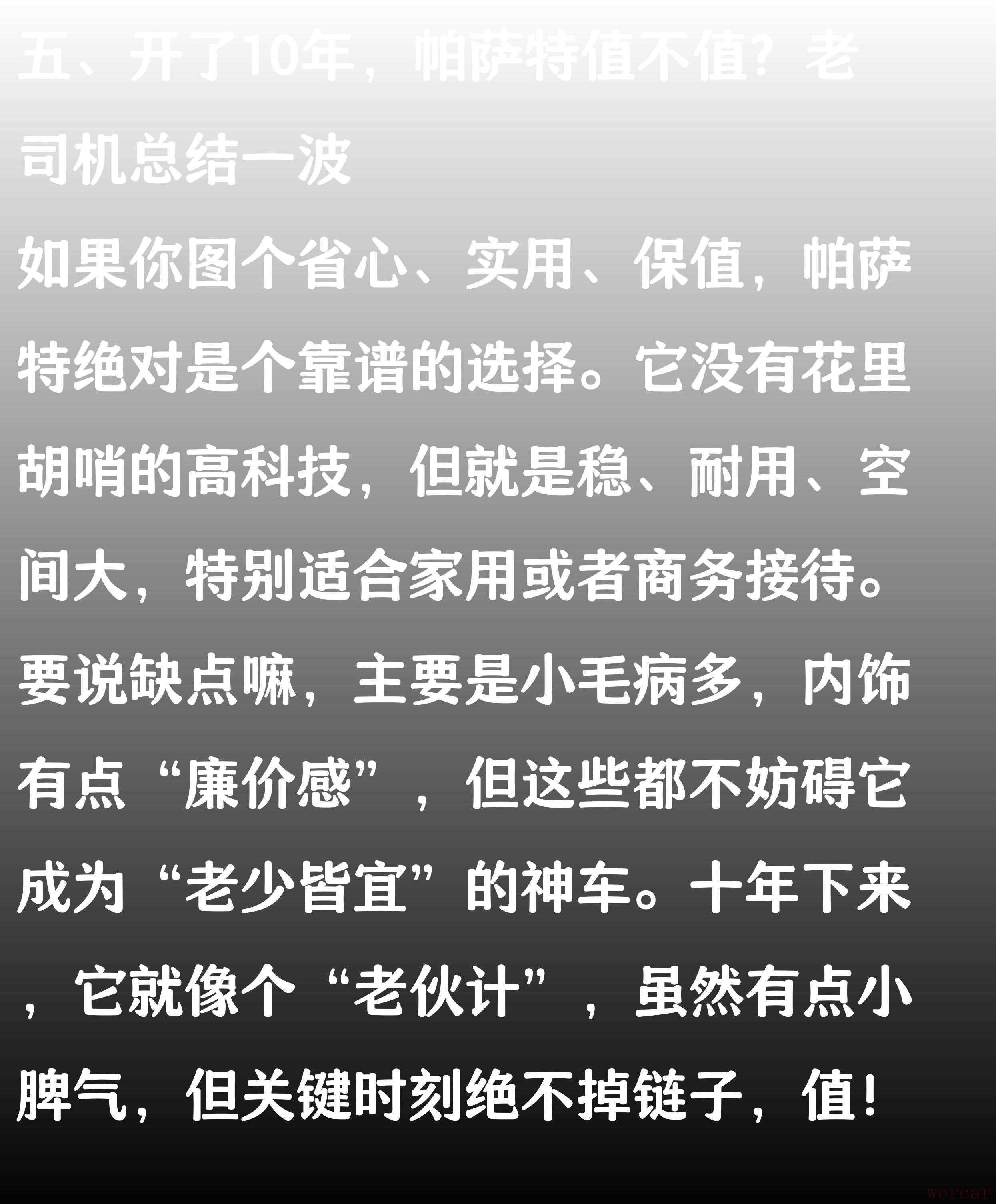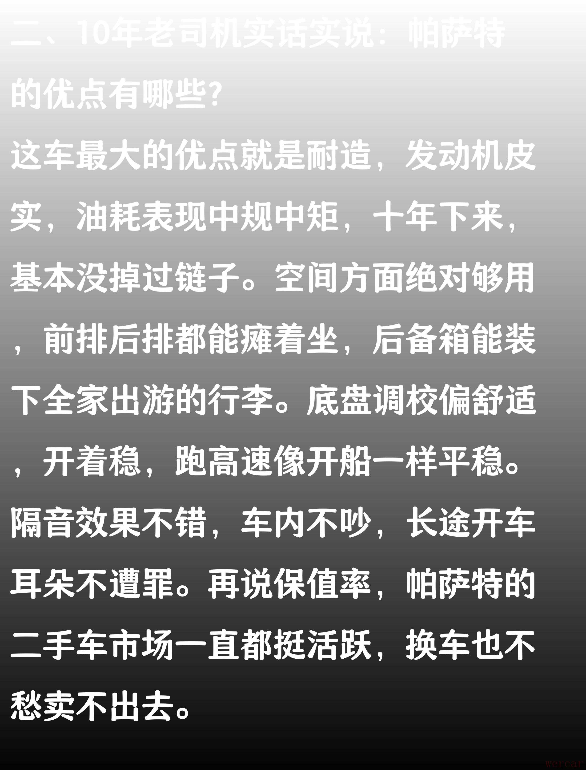 帕萨特作为一款在中国市场长期畅销的B级车,确实有很多车主。开了10年左右,对它的优缺点应该有更深刻的体会了。我们来详细梳理一下: