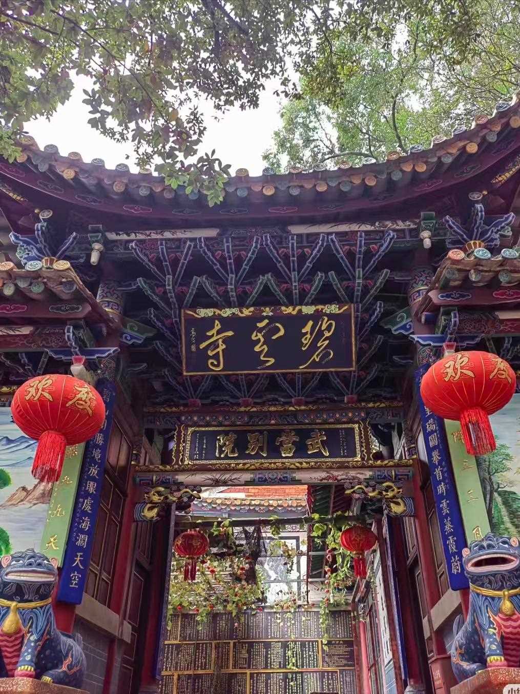 还有碧云寺,在碧云山上面,要爬499级台阶转36道弯才能到,是道教的仿古建筑,每年三月三有庙会,滇中人都来集会,庙里香火挺旺,站在山上看湖视野也开阔,就是台阶太陡,年纪大的得慢慢爬。