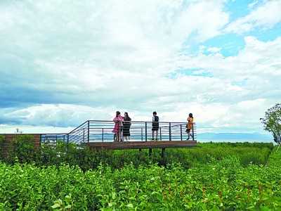 抚仙湖北岸的抚海湾湿地,游人远眺风景。光明日报记者张勇摄/光明图片