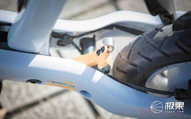 打开光环的操作很简单,只需要先把后轮上有一个黄色挂钩往里面按一下,然后就可以直接展开车身;在车座的下方有一个拉环,用力一按,即可固定好车身,用力往外拉,即可折叠整车。
