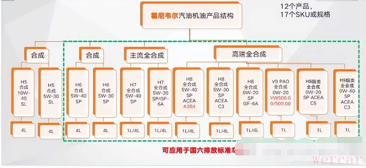 这也使得不同硬件的发动机对于机油的特性要求是不同的。就像不同的汽车品牌通过不同的车型来满足,机油品牌也会通过产品矩阵来满足不同车型间的需求差异。我们可以拿霍尼韦尔的机油产品型谱来举个例子。霍尼韦尔作为发动机领域的知名供应商在过去几十年里对于发动机技术的进步做出了许多成果,而他们整个在机油领域的产品线一共有12个产品: