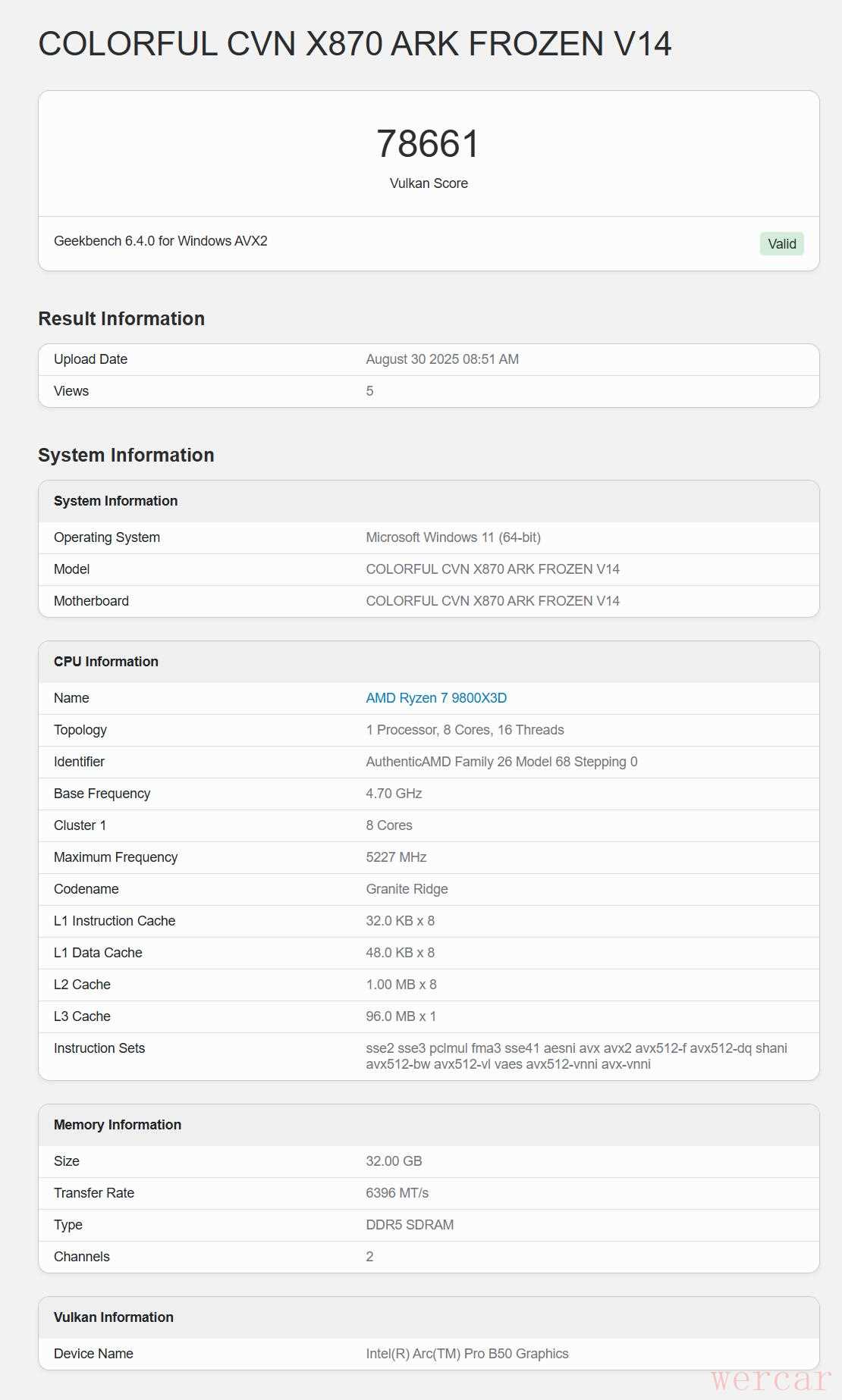 在Geekbench Vulkan和OpenCL测试中,Pro B50分别获得78,661分和69,890分。相比同系列的Arc B570,平均成绩约10万/8.5万分,性能有着20-25%的差距。这样差距主要源于这两张显卡GPU核心配置差异,Pro B50采用16个Xe2核心,而B570采用18个Xe2核心。