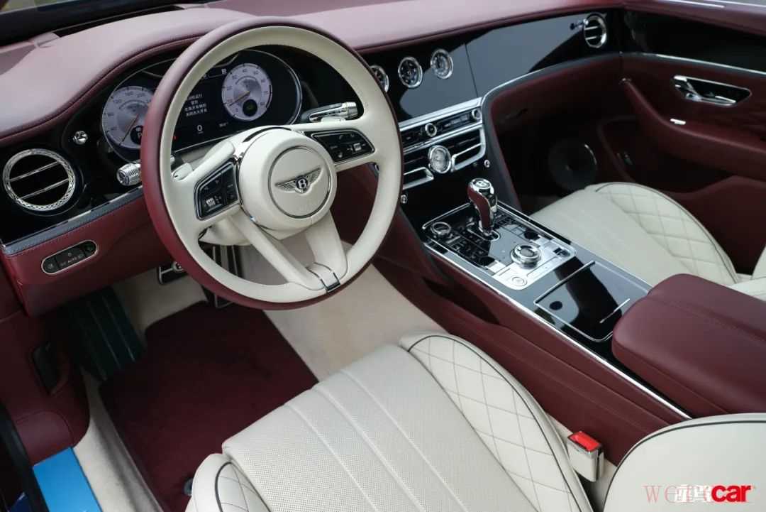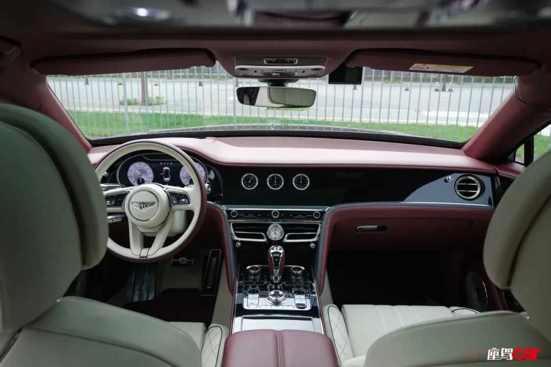 座舱同样充满了奢华气韵,MULLINER版的优势在于可以为客户提供无限种内饰定制方案,客户既可以根据个人喜好自由定制配色组合,也可以从基于宾利品牌丰富的皮革和缝线选择打造的8种三色配色方案中选择心仪的款式,自由度非常高。事实上,仅是在官网上提供的方案,我们就已经看的眼花缭乱。这台试驾车的座舱与它的车身漆面做了出色的呼应,它以暗红为主色调覆盖车内仪表台及门板大面积的区域,座椅则采用了亚麻白色,不仅凸显出MULLINER的奢华格调,同时也不失宾利欧陆系列注重运动驾驶的本性。标配的MULLINER驾驶套件为座椅引入双菱形绗缝工艺,车门处则采用三维立体设计的皮革。座椅反衬色绲边与环绕乘坐者的对比增强色内饰彼此相衬,自中控台延伸往仪表板直至车门腰梁下,进一步突出宾利汽车“B”字镀铬饰件。中控台和后控台表面饰有融合当代工艺与奢华格调的菱形滚花纹理。仪表板中部装载一台精妙绝伦的拉丝银材质MULLINER车载时钟,两侧配以镀铬牛眼式出风口。