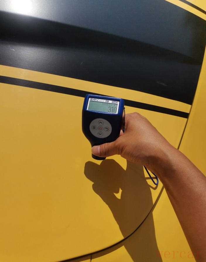 前盖的漆面厚度测出来大概在300多微米,有可能有喷漆,但是因为贴膜的原因没法确定。主要是因为没有原车漆的厚度可以对比,因为这台车的车顶都是修过的,漆膜仪打上去漆面厚度直接在1300多微米,不过好在大概只有一个巴掌那么大点。